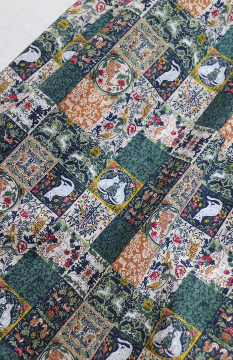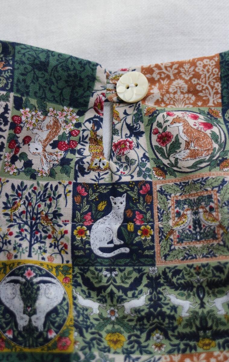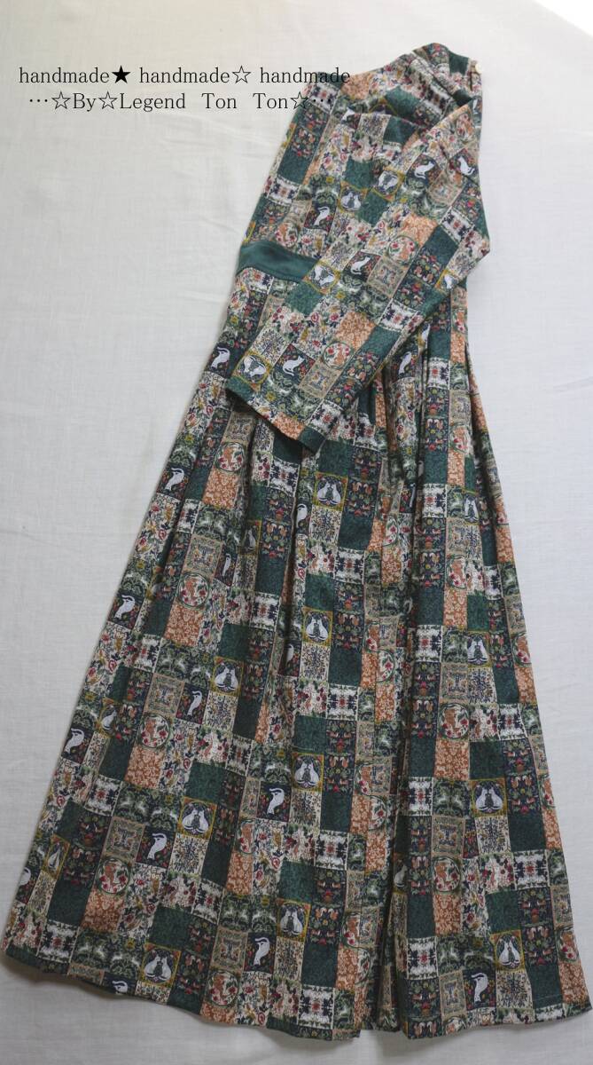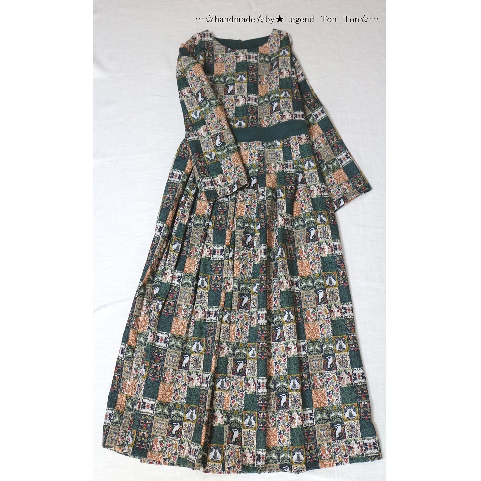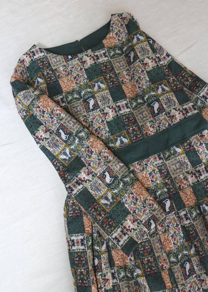 身頃切り替え下にダークグリーンのリネンのマチを挟み切り替え下はタックスカートになります