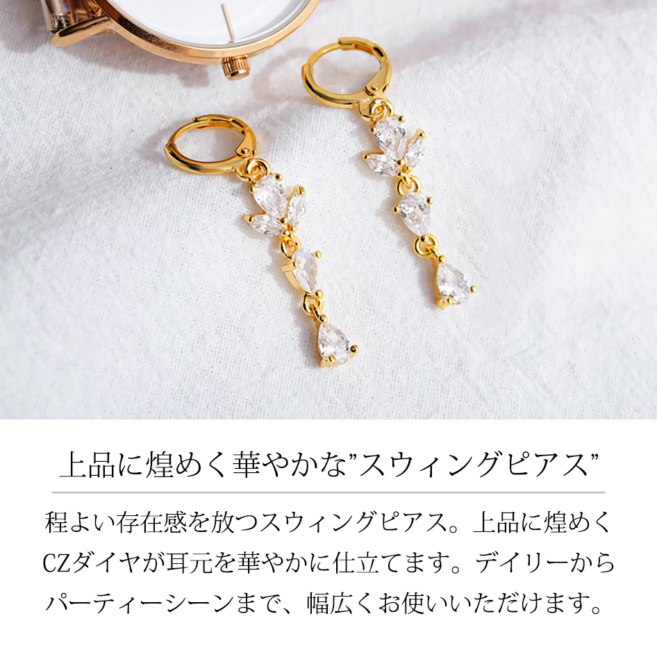 新品/ピアス/K18GP/ドロップ/揺れる/ロング/ダイヤ/18金/ゴールド/レディース/両耳/開閉式/フープ/シンプル/長い/上品/CZ/女性