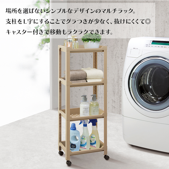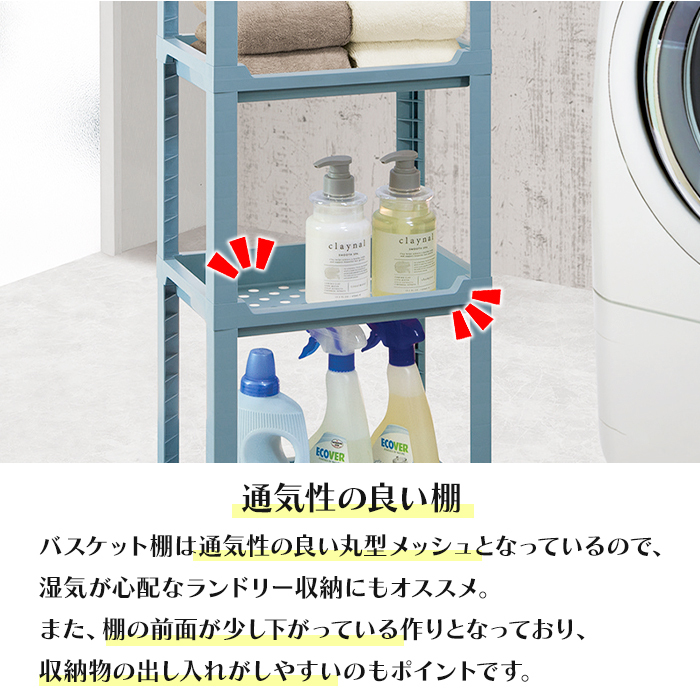 通気性の良いメッシュ仕様のバスケット棚はランドリー収納にもぴったりで、ペットボトルや洗剤ボトルなど高さ27cmまでのアイテムをすっきり収められます。