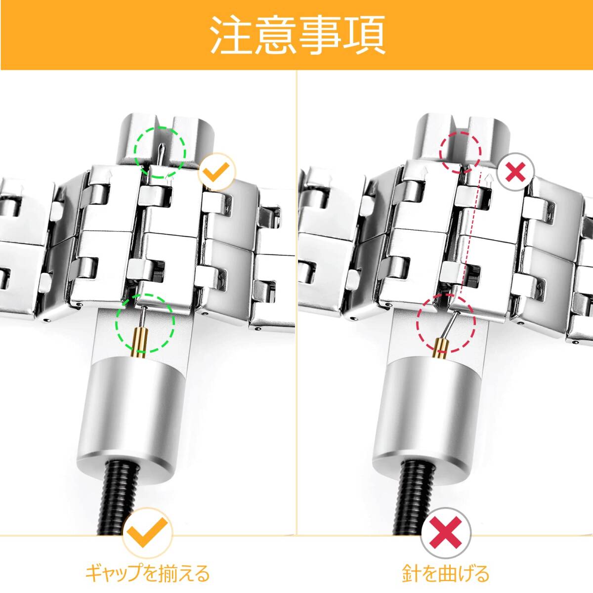 【注】-- 金属ストリップリムーバーを使用してピンを引き抜かない場合は、次の条件が発生するかどうかを確認してください。 1. 刺し針の方向がベルトの矢印の方向と異なります。 2. 金属ベルトプーラーの前面にあるベルトピンホールがギャップと一致していません。 ベルトを調整してください。 調整しないと、プーラーの針先が曲がり、時計が破損しやすくなります。