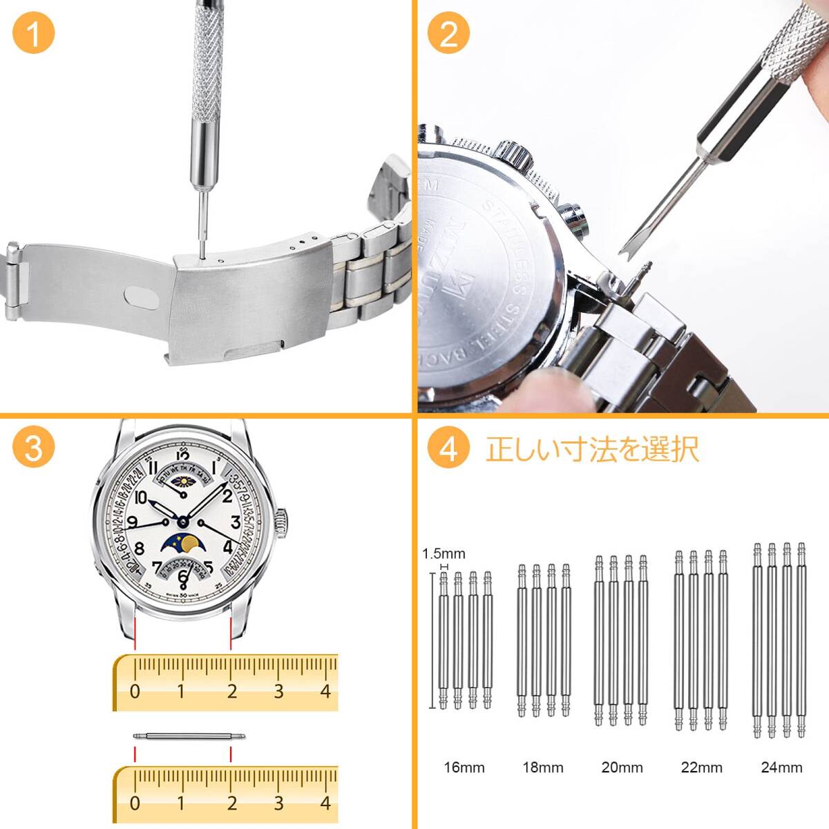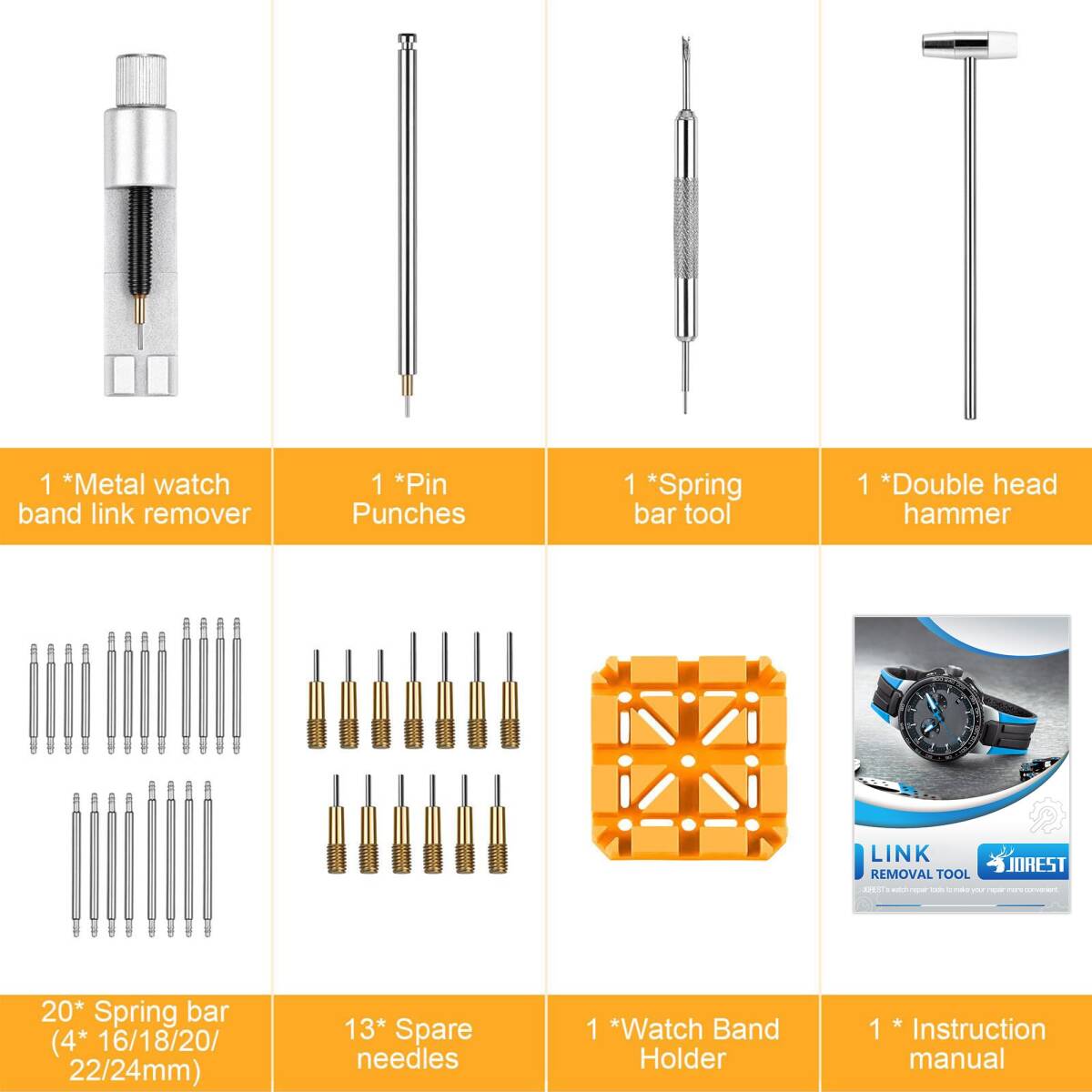 【JOREST】時計ベルト調整工具セット、腕時計 ベルト交換 工具、バネ棒外し 、腕時計 ピン抜き工具、取扱説明書、20個 バネ棒、13個 交換針、取扱説明書(英語版)