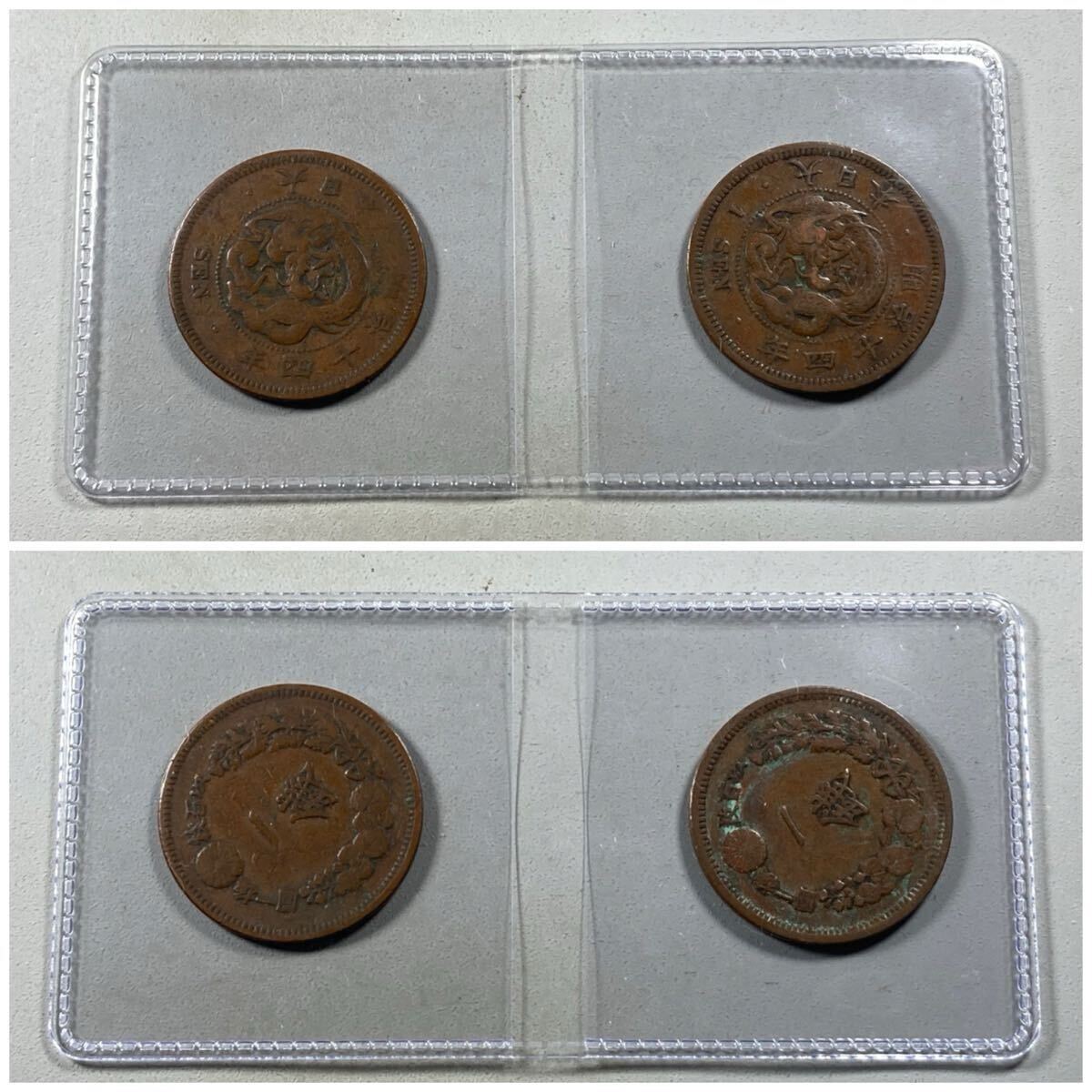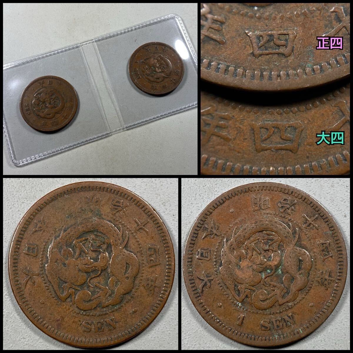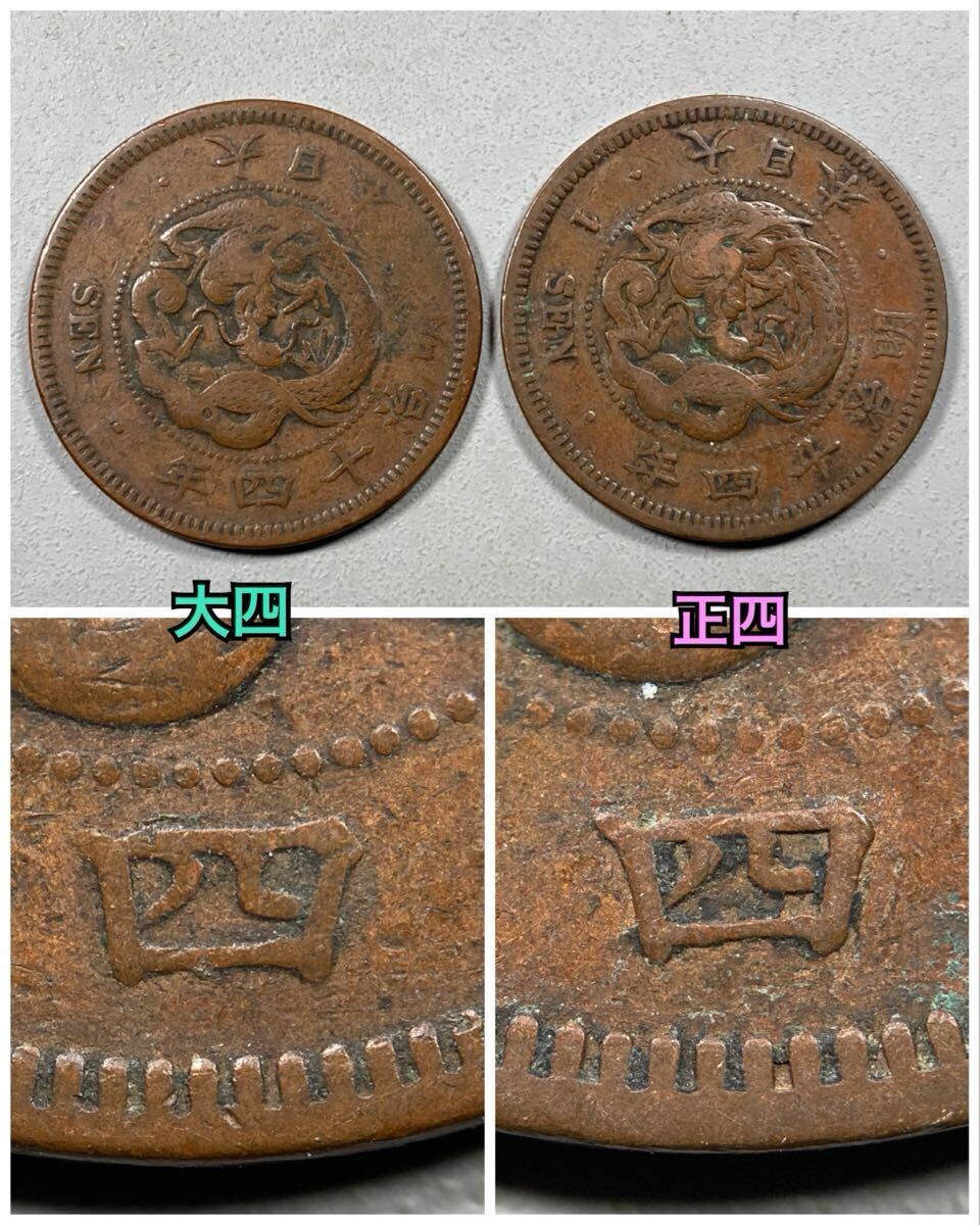 こちらは竜1銭銅貨の明治14年で《大四(稀少型)》と《正四(標準型)》の2枚セットになります。