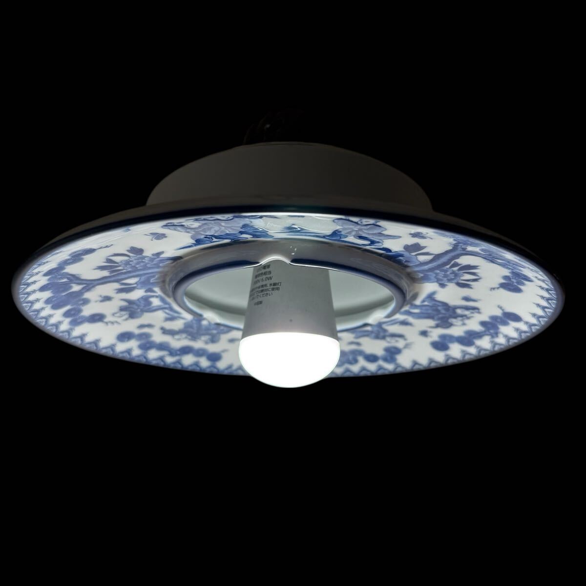 唐子柄のペンダントライトです。味わいのある有田焼の陶器をリメイクして作られています。重量があるため,コードに負荷がかからないように吊元は別に吊れるように作られています。