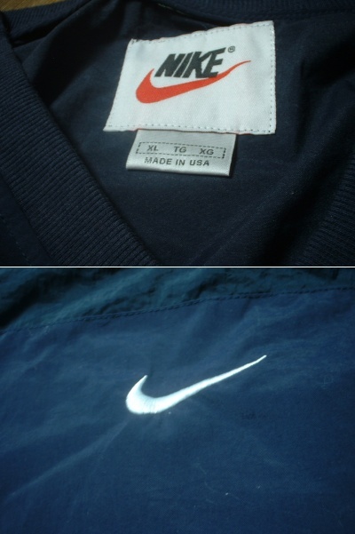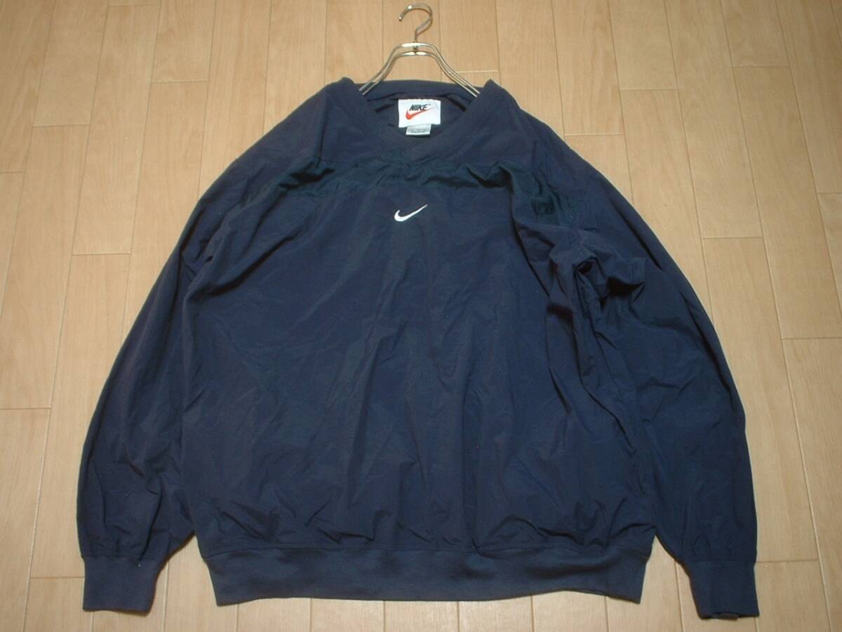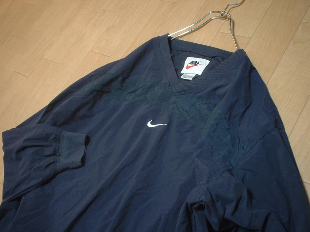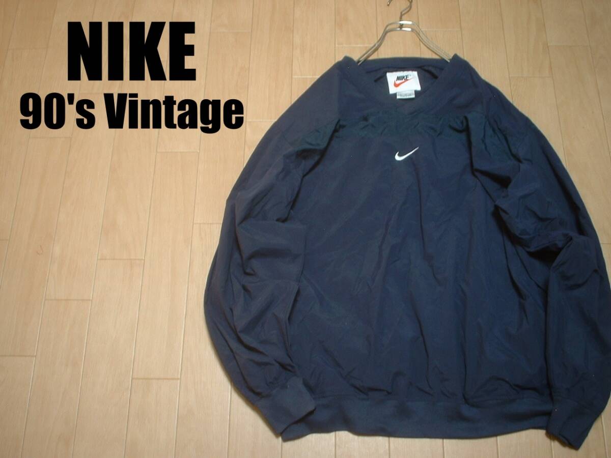 90sビンテージUSA製NIKEスウッシュ刺繍ウインドブレイカーXL米国製プルオーバー正規ナイキMADE IN USAネイビー紺ナイロンジャケット