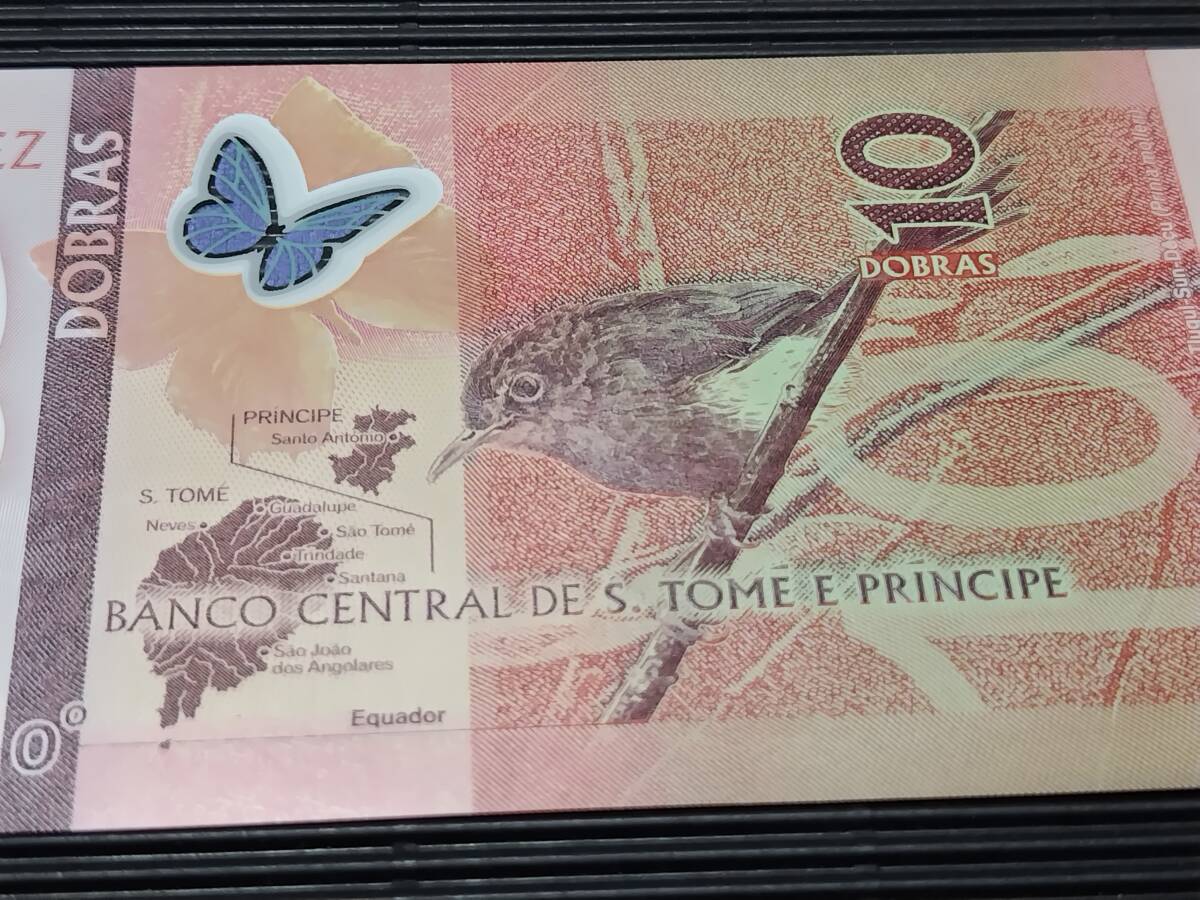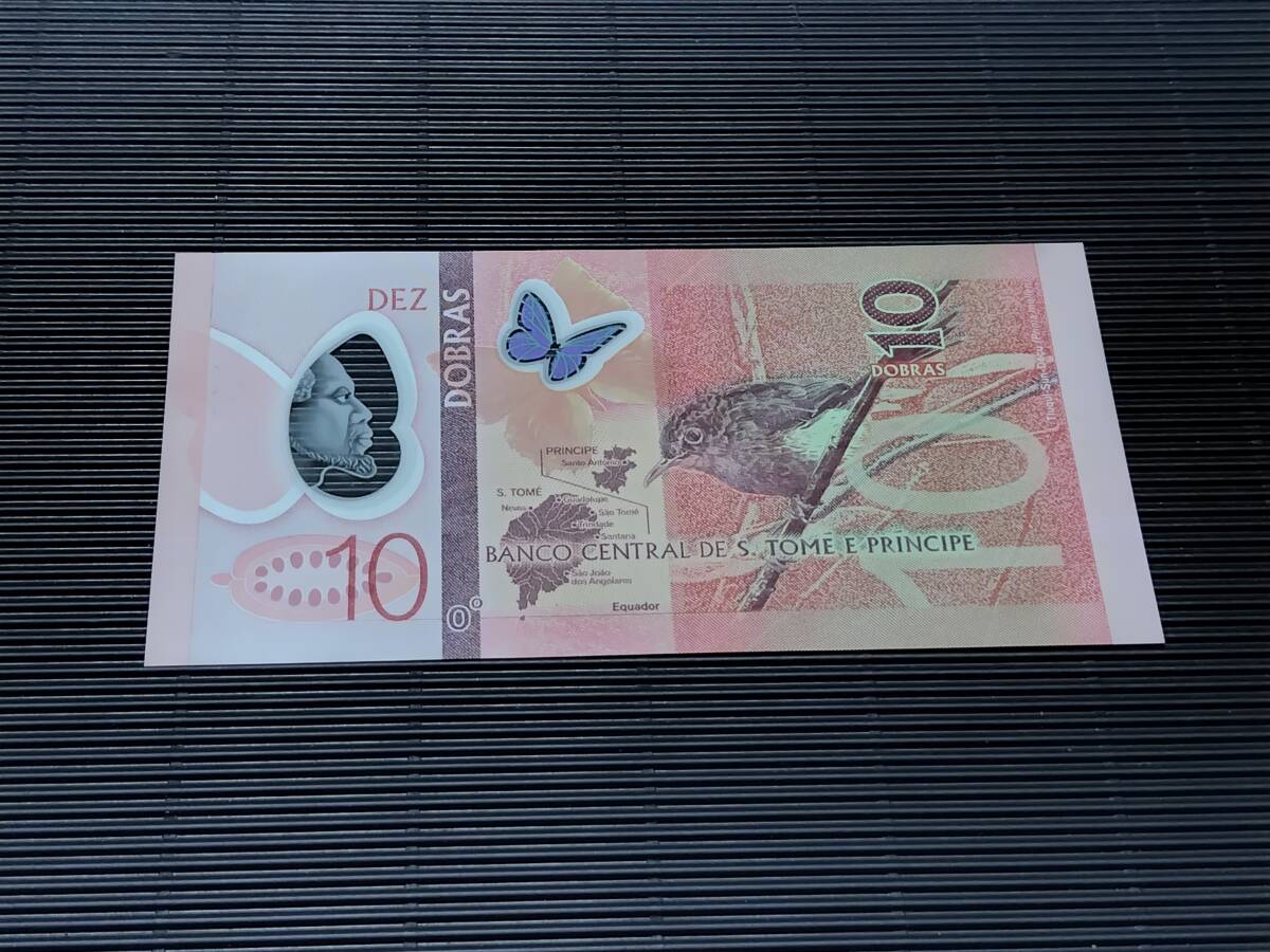 サントメ・プリンシペ  10 Dobras札  ポリマー紙幣 コレクション向けピン札  2016年10月21日  未使用 蝶 鳥 p-71 #AB0011308