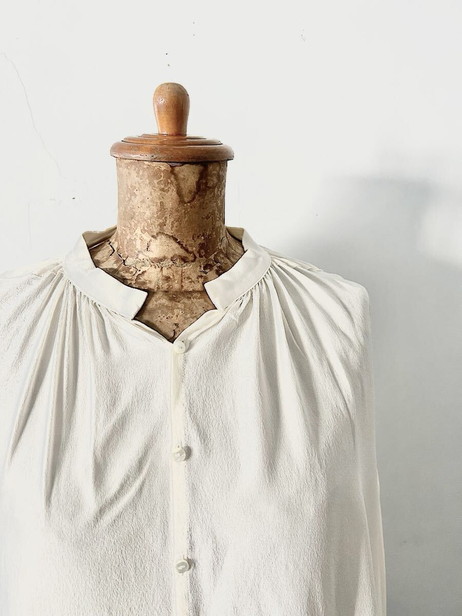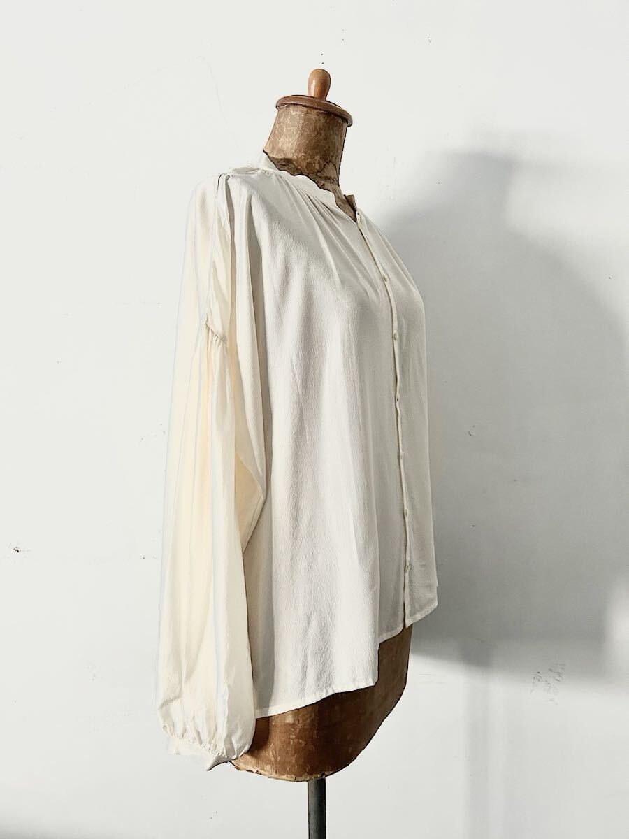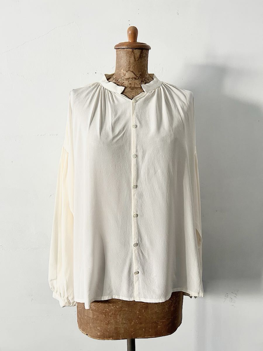カラーはアイボリーでシルク100%素材のギャザーブラウスです。