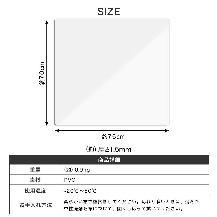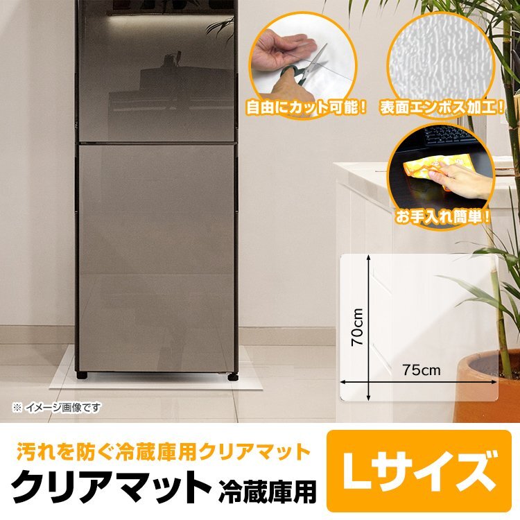 | 冷蔵庫の重みによるキズや凹みの防止する、冷蔵庫用クリアマットです! 汚れや水漏れによるカビ対策にもおすすめ!! 半透明のマットなので、お部屋の雰囲気を損ないません。 水や汚れに強い素材を使用! サッと拭き取るだけでお手入簡単☆ 気温や湿度などに対し変質や劣化を起こしにくい性質なので、 長期に渡って使用しても変形しにくいマットです。 また、お好みのサイズに合わせて、ハサミやカッターで自由にカット可能! 冷蔵庫以外にも家電、家具、ダイニングテーブル、オフィスデスク、チェア等 様々な汚れや傷から守るマットとして使用できます♪ 【商品仕様】 カラー:クリア サイズ(約):幅75cm×奥行70cm(厚さ1.5mm) 重量(約):0.9kg 材質:PVC 使用温度(約):-20℃~50℃ 【注意事項】 ・お手入れは柔らかい布で空拭きしてください。汚れが多い場合は、薄めた中性洗剤を布につけ、固く絞って拭いてください。 ・商品はモニターによって色合いが異なって見える場合があります。 ・仕様/デザインは改良のため予告なく変更することがあります。 (保護シート 保護マット マット クリア 大型冷蔵庫 大容量冷蔵庫 ファミリーサイズ 冷蔵庫の下に敷くマット 人気 安い) |