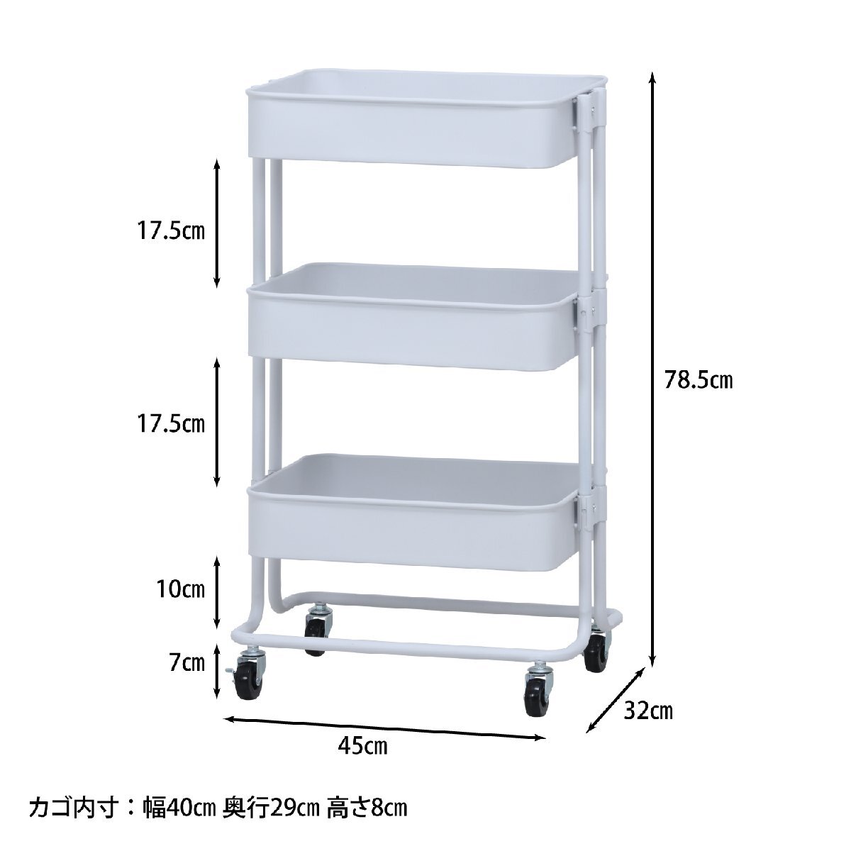 サイズ | 全体:幅450 × 奥行320 × 高さ785mm 耐荷重(カゴ1段):15kg カゴ内寸:400x290x80mm ※サイズ詳細はサイズ画像をご参照ください。 |