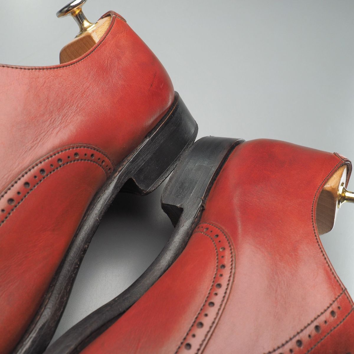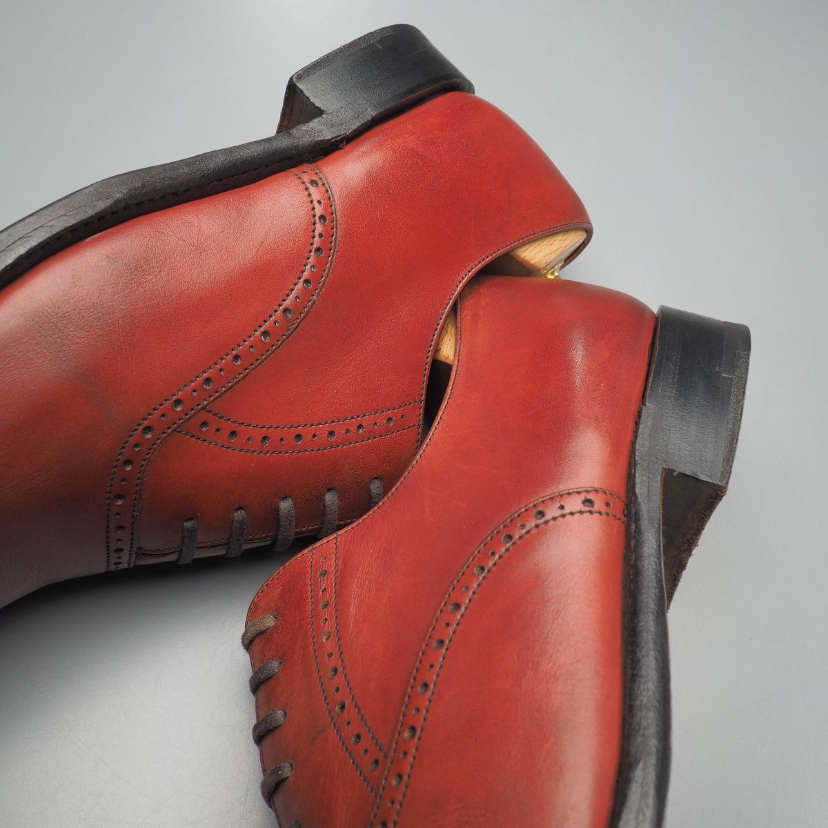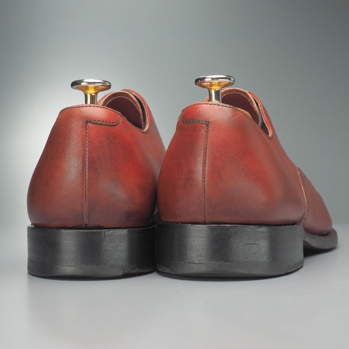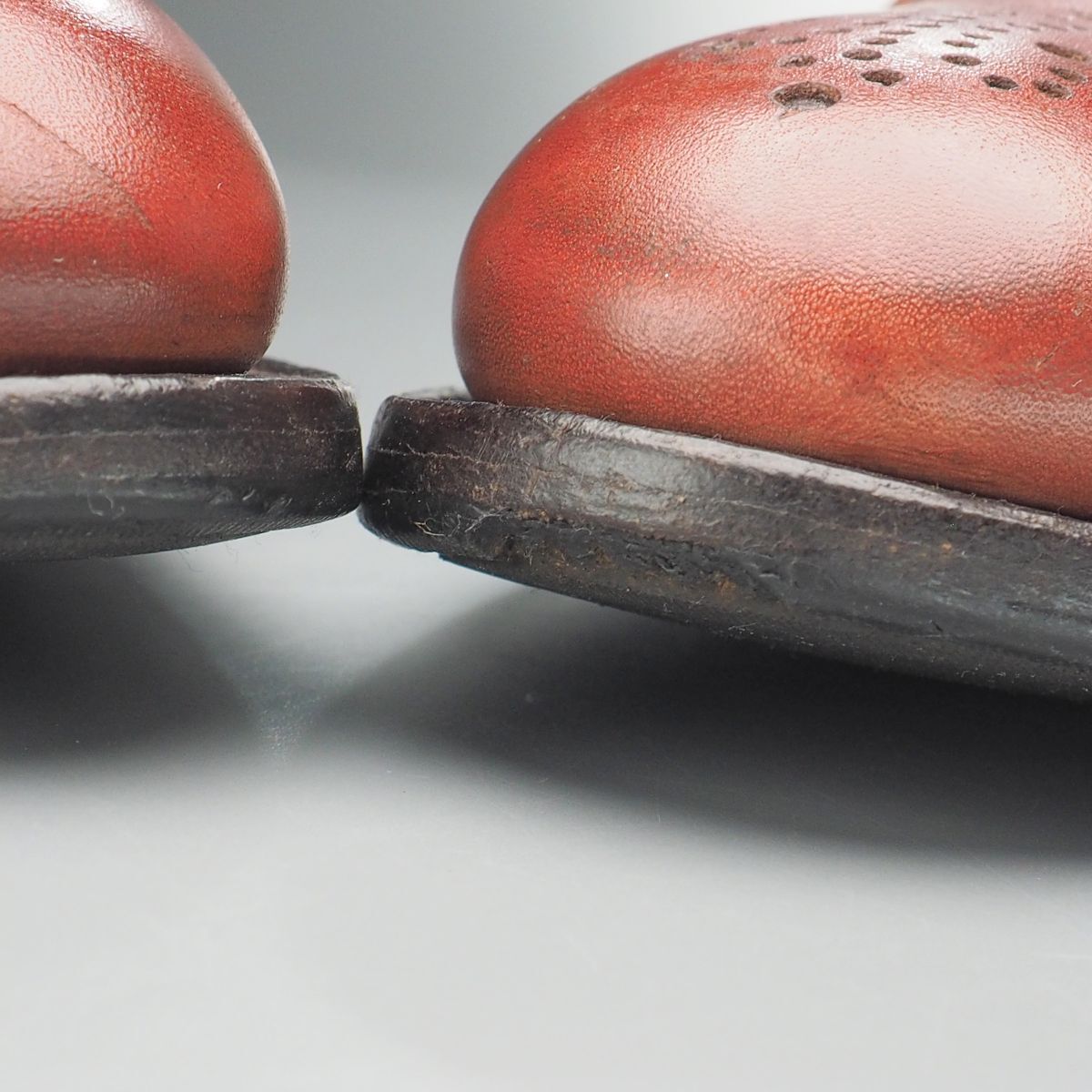 【コンディション詳細】 アッパーのシワ、所々薄い擦れキズや色ムラ、薄汚れ、またインソールやライニングの薄い擦れが見られますが、その他気になるようなダメージ等なくこれからも気持ちよくご愛用いただけます。 アウトソールの減りはトゥ・ヒール共に2~3mm程度、写真のように左足のトゥのラバーに欠けが見られますので、ご必要に応じて半張りなどの補強・補修をお勧めいたします。 |