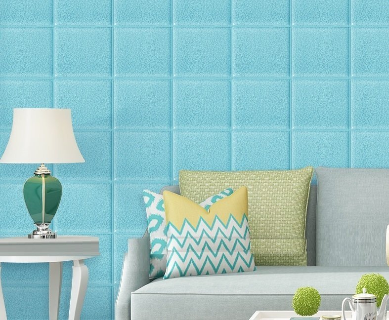 【10枚】高品質 3D クッション 壁 シール スクエア×ブルー レザー タイル調 糊付き リメイク 70×77cm 耐水 抗菌 傷防止