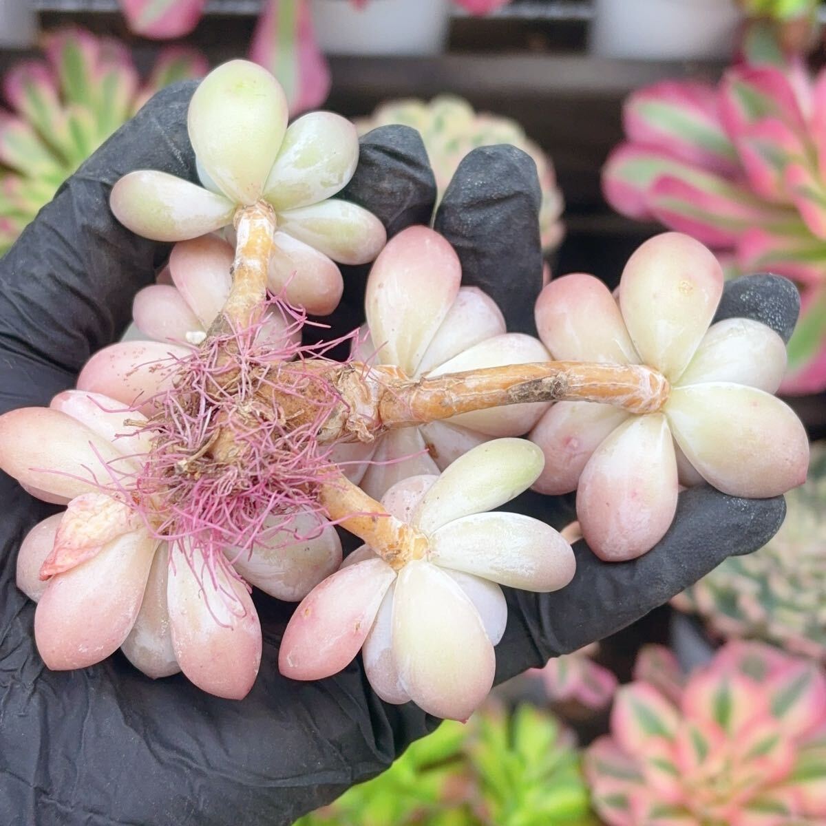 輸入検疫の関係で根の処理がされております。現在は鉢に仮植えして発根管理をしておりますが、基本的には「無根」とお考えてください。