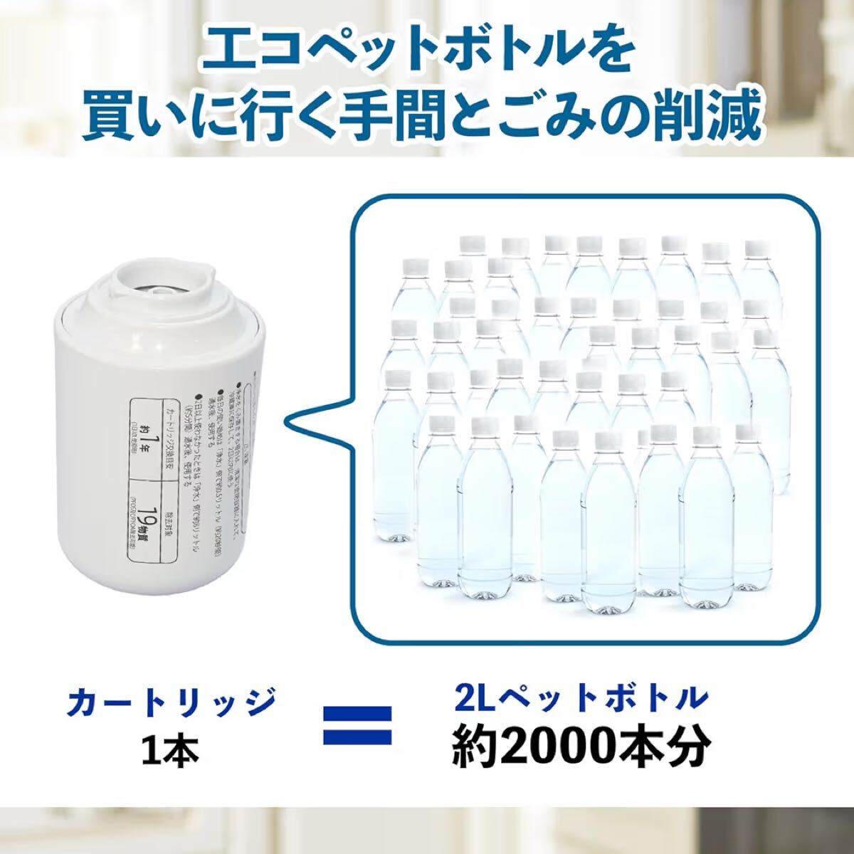 1つのフィルターで2Lペットボトル約2000本分を浄化。年1回交換でOK。原水・浄水の2段階モードに対応。使用素材:ABS樹脂、活性炭繊維(ACF)、粒状活性炭、中空糸膜、親水性不織布。水の純度と口当たりを改善し、ミネラルウォーターのような味わいを実現。