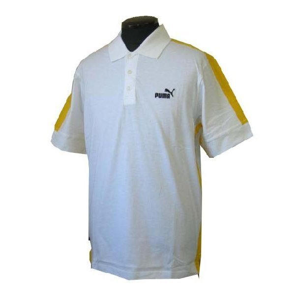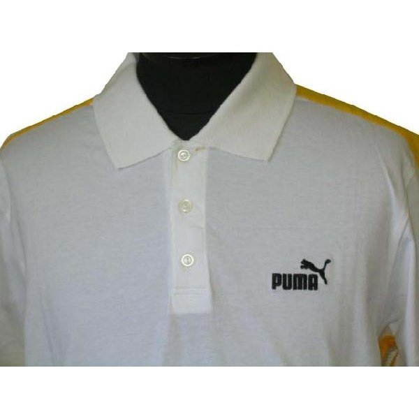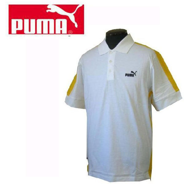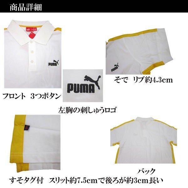 PUMA(プーマ)ポロシャツ #501467 シロ(L)です。 ■素材 コットン100% ■サイズ Lサイズ 身幅約60cm×着丈約75cm ■特徴 肩、BODYサイドの両ラインが非常に鮮やでキリっと印象を引き締めてくれる、涼しげなポロシャツです。 | ||||||