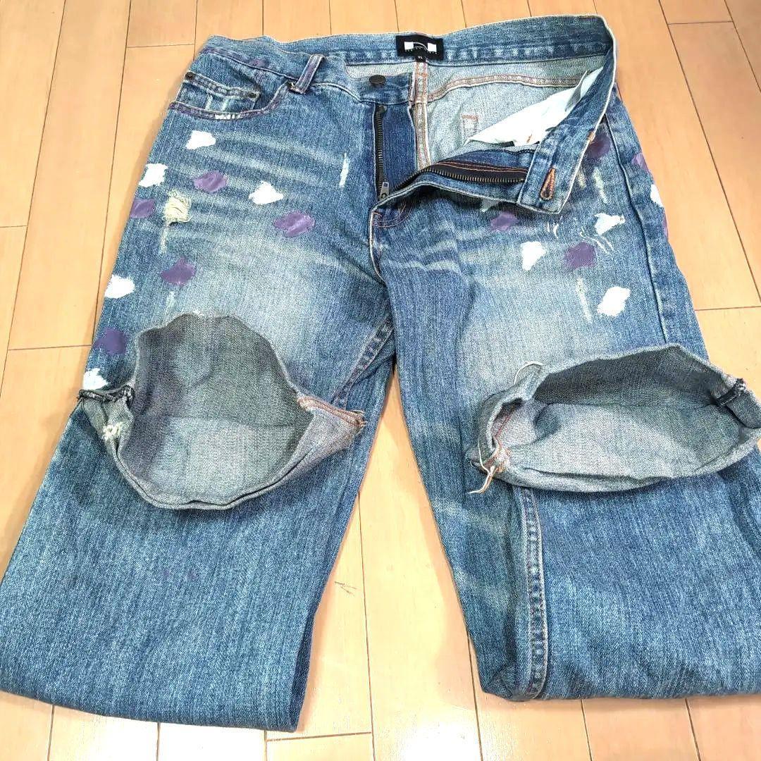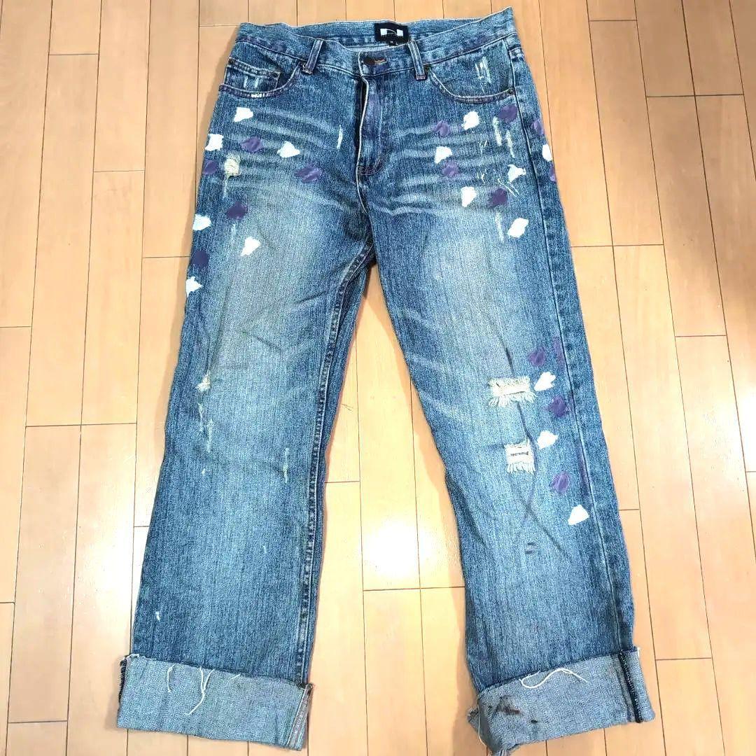 フロントとサイドに施された大胆なペイント&ダメージ加工が目を引く一本で、個性派コーデを楽しみたい方にぴったり。シルエットはゆったりとしたストレート寄りで、カジュアルスタイルと相性抜群です。
