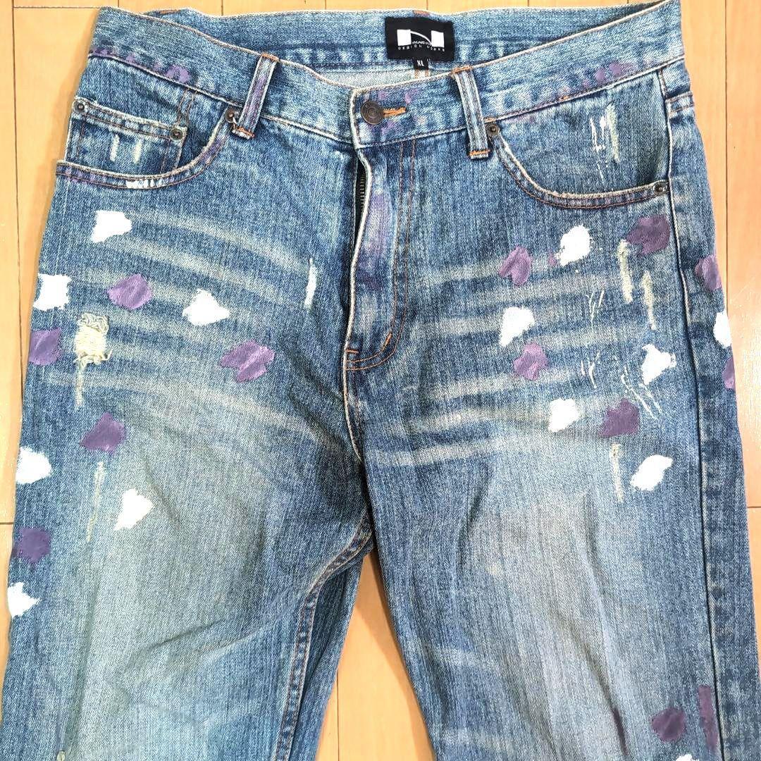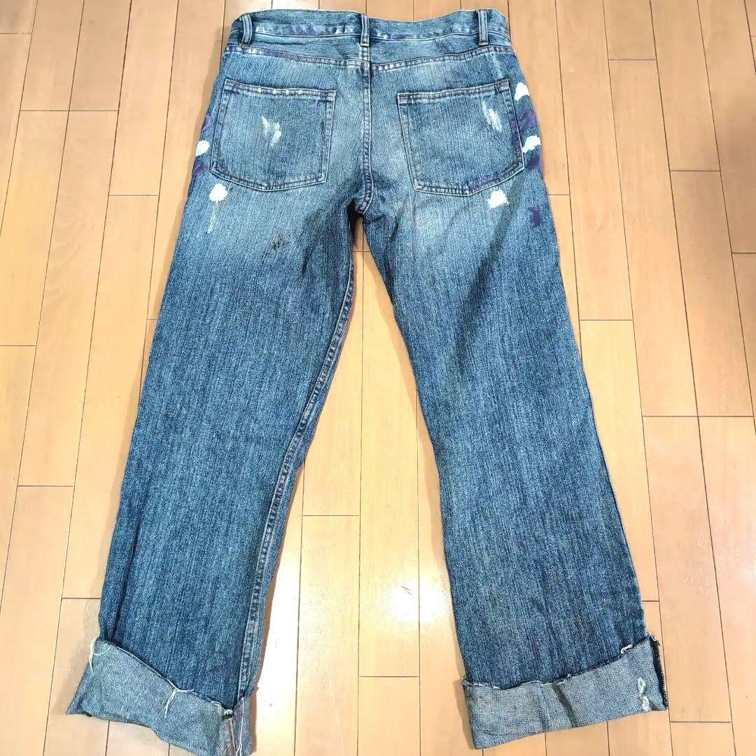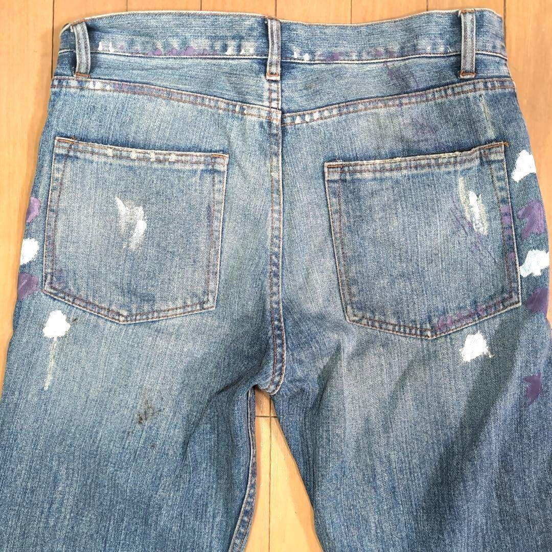 全体にペイント跡・ダメージ加工が多く施されたデザインです。着用に伴う色落ちや擦れがありますが、デザインの世界観としてお楽しみいただける状態です。致命的な破れはありません。