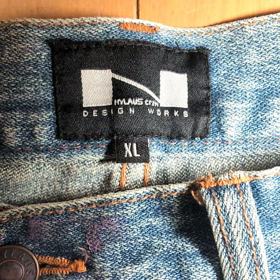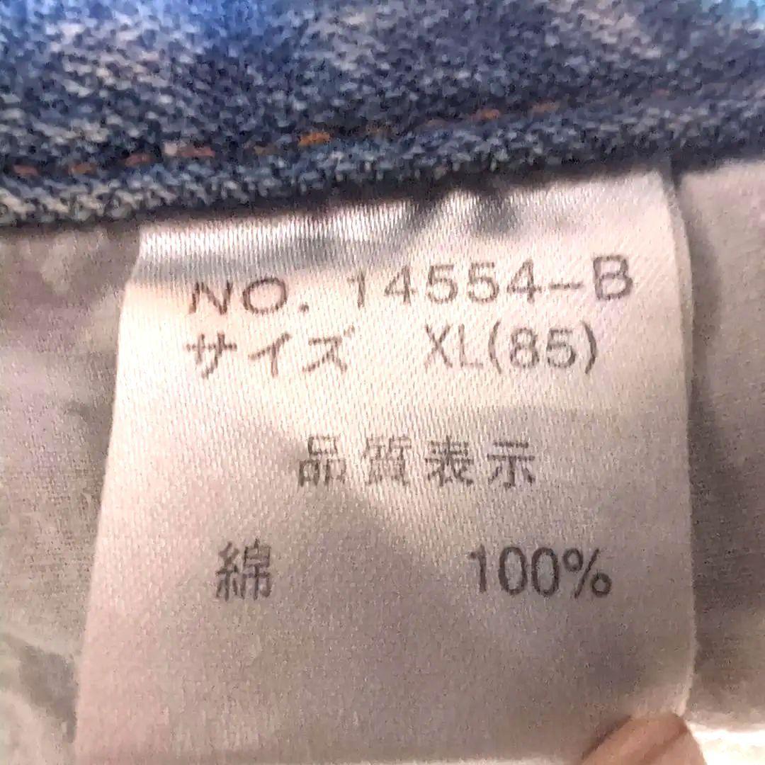 平置きウエスト42cm(約84cm)より、W33相当 のサイズ感です。表記サイズは XL(85) です。デニムらしいハードなエイジングやペイント跡など、ワーク感のある表情も魅力です。