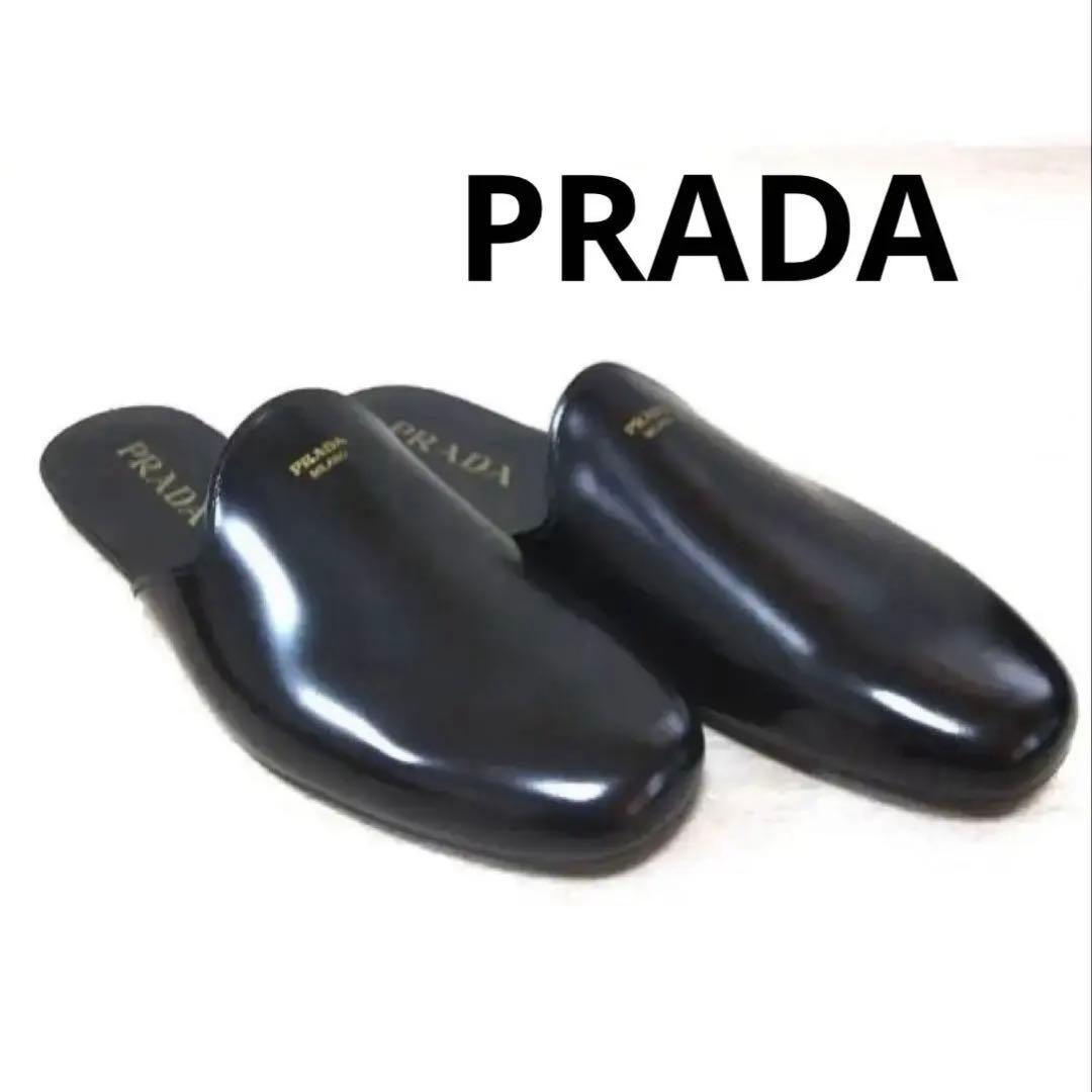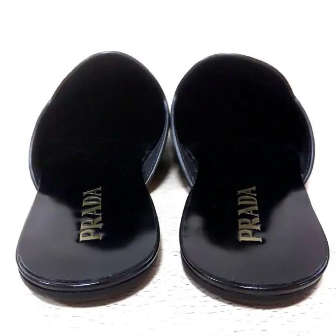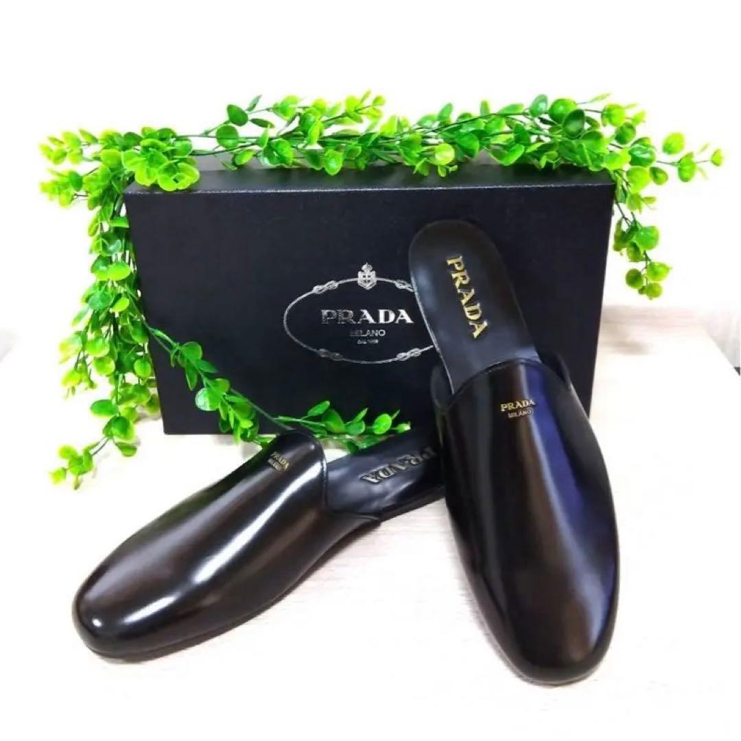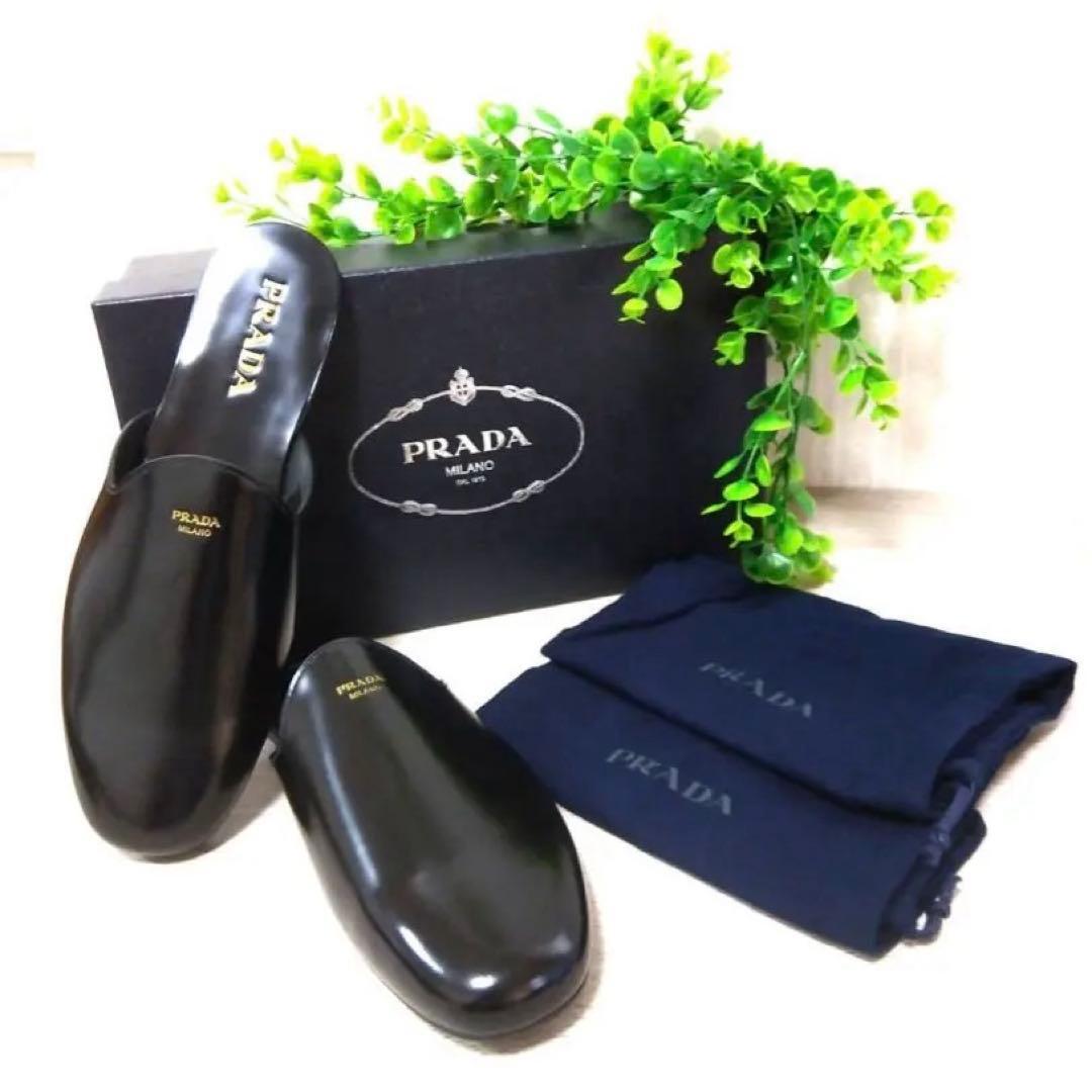 PRADAのレザー製黒スリッパ、箱と布袋付き。