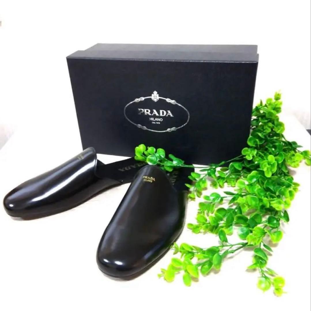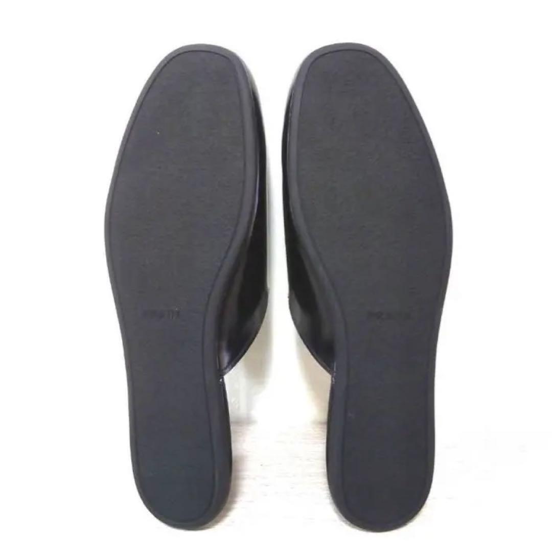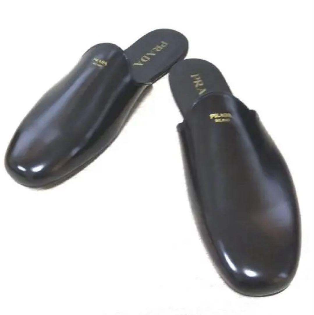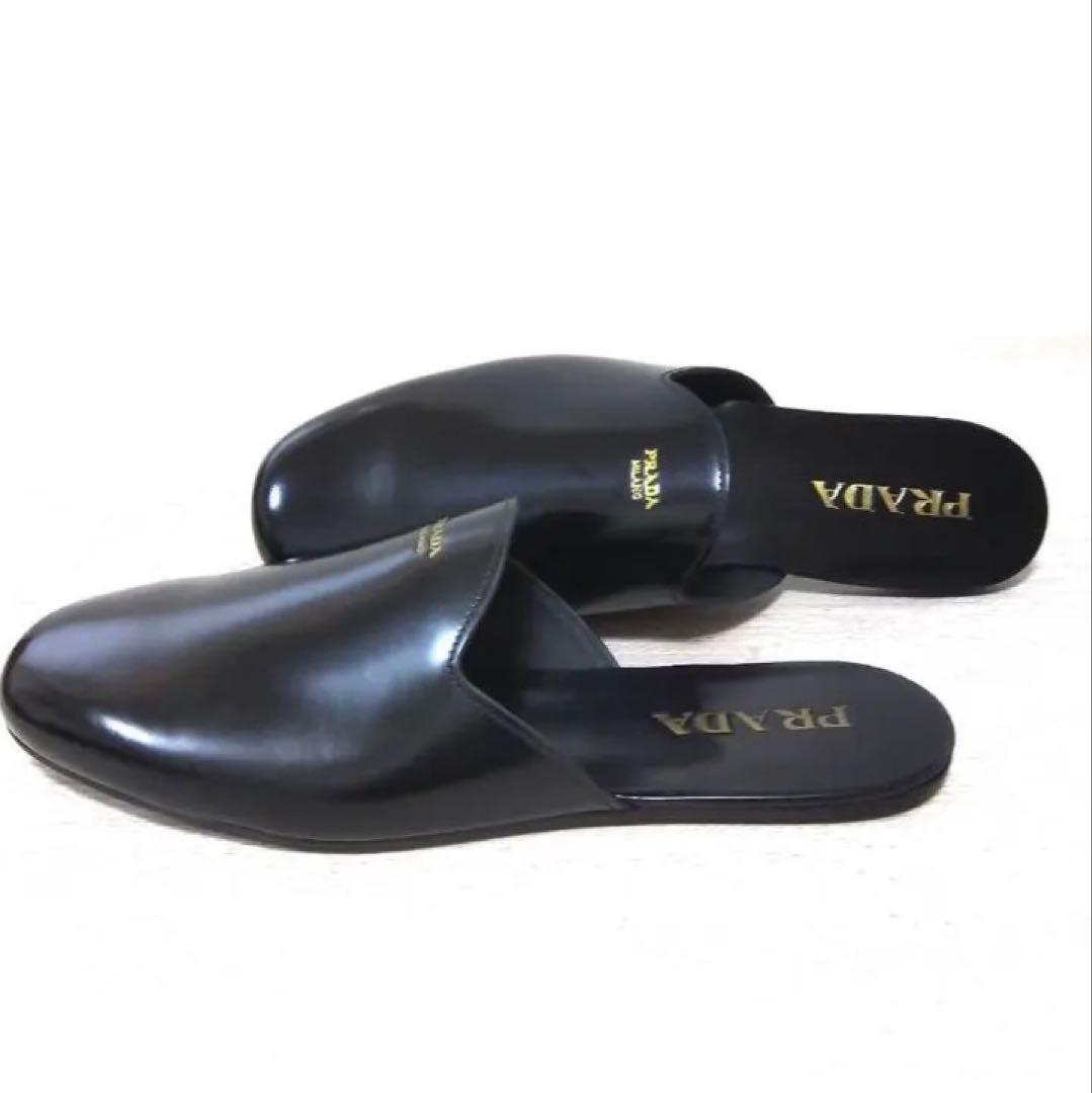PRADAのレザー製黒スリッパ、箱と布袋付き。