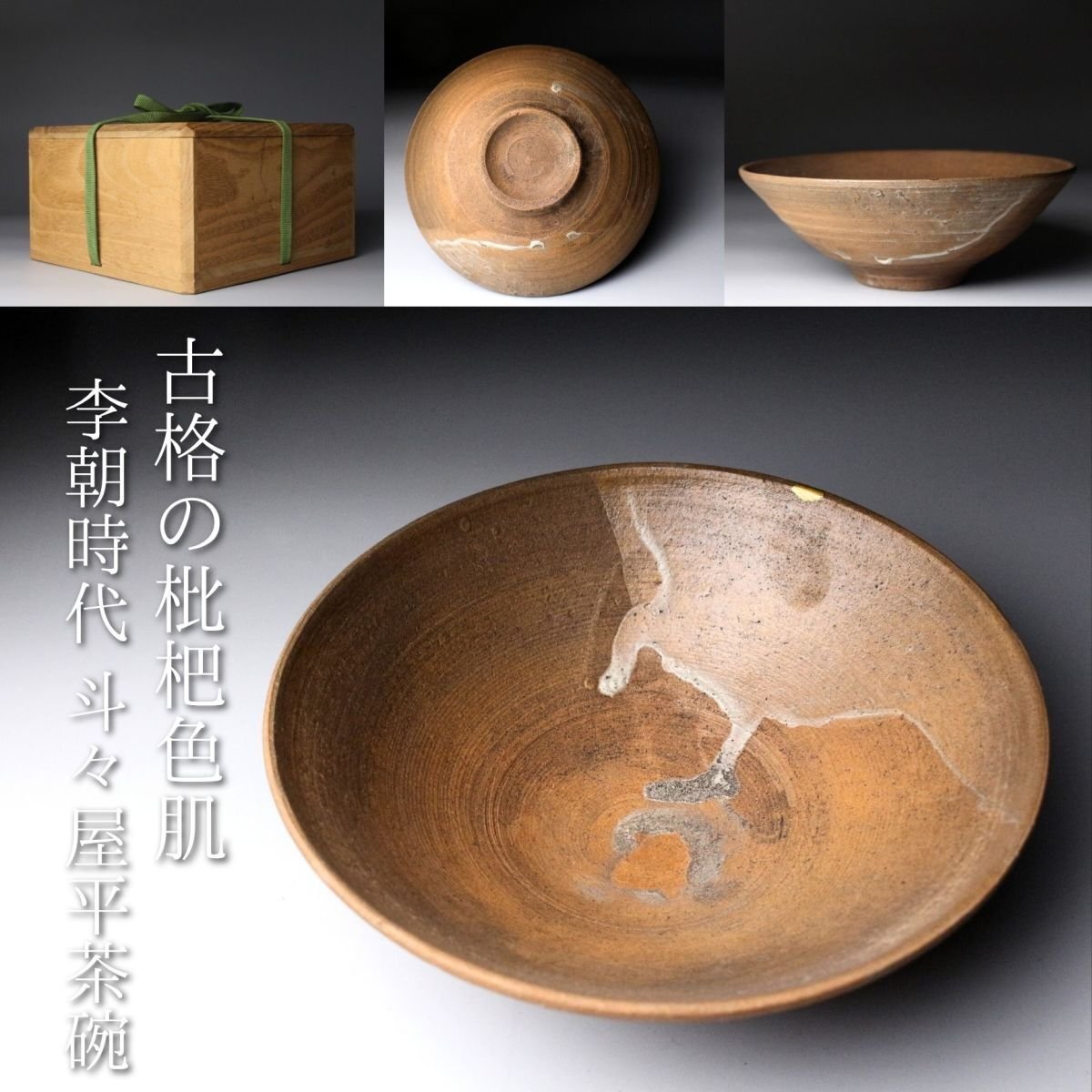 * * * 商品詳細 * * * ここでしか出逢うことのできない唯一の美をご紹介させて頂きます。 古格の枇杷色肌 李朝時代 斗々屋平茶碗 千利休が堺の魚棚より見出したと伝わる「斗々屋茶碗」。 その質朴の美は、やがて茶の湯の根幹をなす「わび」の象徴となりました。 本作は、平斗々屋特有の盞形をなし、浅く穏やかに開く姿はまるで朝顔の花のよう。 控えめな高台の佇まいに、静けさと風格が漂います。 古格の枇杷色肌には、長い歳月を経たやわらかな温もりが宿り、 釉がわずかに掛かることで、素地の風合いが豊かに表れ、李朝陶の素朴な息づかいを伝えます。 手に取れば、掌にしっとりと馴染み、指先を通して伝わる温もりが、 利休の美学 ― 侘び寂びの精神 ― を今に語りかけるようです。 茶席に静かなる風情を添える、まさに時代の風が息づく一碗。 この機会に、心静かにその趣をお楽しみください。 ■商品内容/ 茶碗、箱 ■サイズ/横18㎝×高10㎝ 箱:横15.5㎝×高5㎝ ■状態/ 経年によるスレ、小傷、汚れ 箱にスレ、小傷、汚れがございます。 ※写真にてご確認、ご了承の上ご入札下さい。