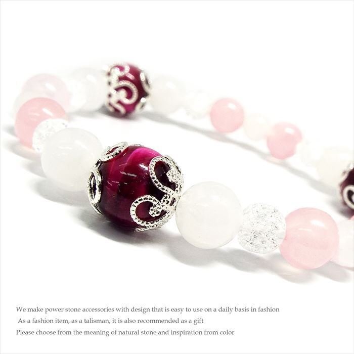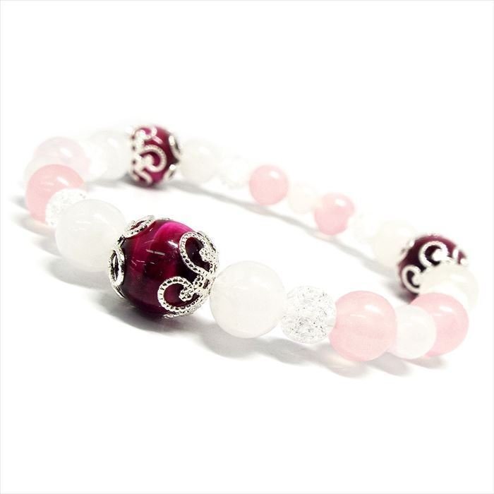 | 【STONE KITCHEN 天然石 パワーストーン】 タイガーアイは幸運を招き、金運・仕事運を上げてくれると言われていますが その中でもピンクタイガーアイは人間関係の円滑化や 人と人との縁を繋ぐなど人間関係が強化されたストーンです☆ 邪悪なエネルギーを跳ね返すパワーがあるのでトラブルで困っている方にもオススメな石です! ローズクォーツは、あなたのハートと呼応する愛の石です。 呼吸を合わせ響き合い あなたを驚かせることなく最適なペースで愛そのものへと誘ってくれます。 内周:約16cm サイズ:ピンクタイガーアイ 約10mm ホワイトジェイド 約8mm・約6mm ローズクォーツ 約8mm クラック水晶 約6mm 1点 注意事項 ※金属部分は汗や汚れ等で変色する場合がございます。気になる場合は 金属磨きや布等で軽くふき取る事をおすすめします。 ※石の種類によっては、艶を引き出すことを目的として、ワックスや着色加工がされているものもあります。 ※表示のサイズは必ずしも最大値・最小値のサイズのものが入っているわけではございません。 ※天然石のため同じものでも色味・模様などが異なります。 ※照明の具合で実際とは色合いが異なる場合がございます。 また、天然素材特有のクラック・内包物を有する場合がございます。予めご了承下さい。 | |