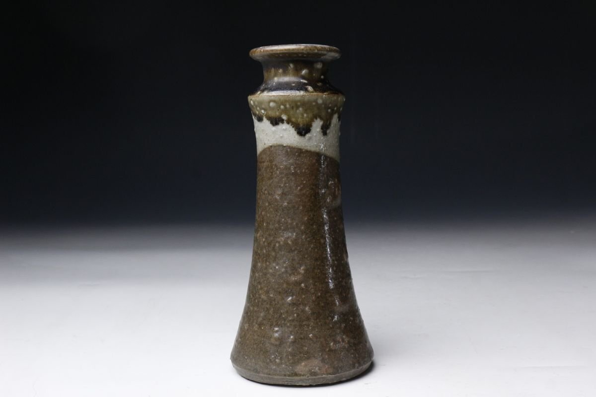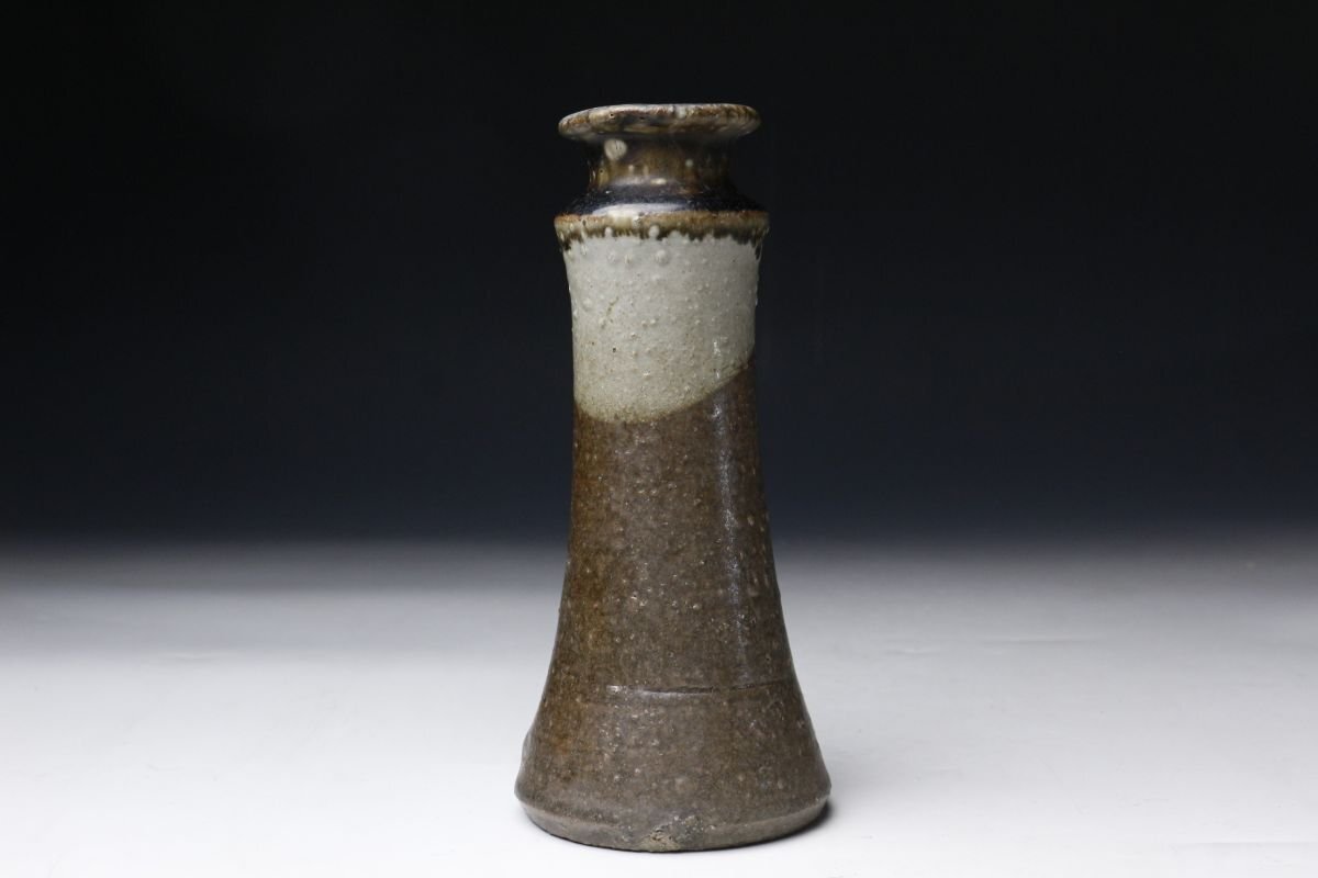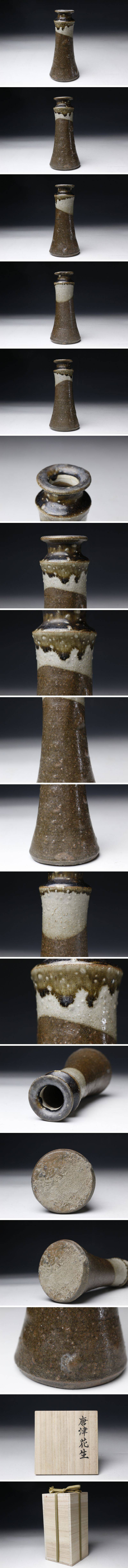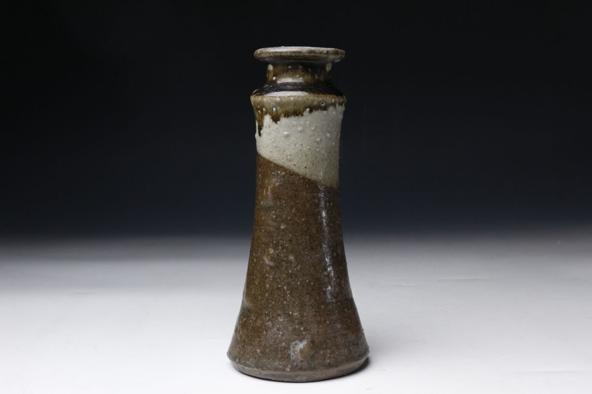 * * * 商品詳細 * * * ここでしか出逢うことのできない唯一の美をご紹介させて頂きます。 本作は、江戸時代に焼成された古唐津の花生で、藁灰釉・鉄釉・灰釉を巧みに掛け分けた、実に趣深い逸品です。 最も目を引くのは、釉薬の掛け分けによる美しい景色。胴部には温かみのある藁灰釉が掛けられ、ややざらりとした質感の中に自然な釉調の揺らぎが見られます。一方、首元には鉄釉と灰釉が重なり、深い飴色から灰白に変化する大胆なコントラストが生まれています。この釉境が首のあたりではっきりと分かれ、まるで一輪挿しとしての生命を宿したような表情を見せています。 手捻りの素朴な造形には、古唐津ならではの温もりと土味があり、控えめながらも力強い存在感を放ちます。 この機会に是非お手元にてご堪能ください。 ■商品内容/ 花瓶、箱 ■サイズ/横8.5cm×高19cm 箱:横11.5cm×高23.5cm×奥行11.5cm ■状態/ スレ、小傷、窯被、汚れがございます。 ※写真にてご確認、ご了承の上ご入札下さい。