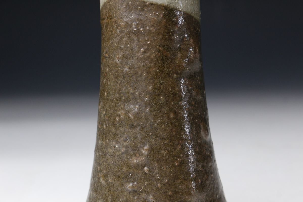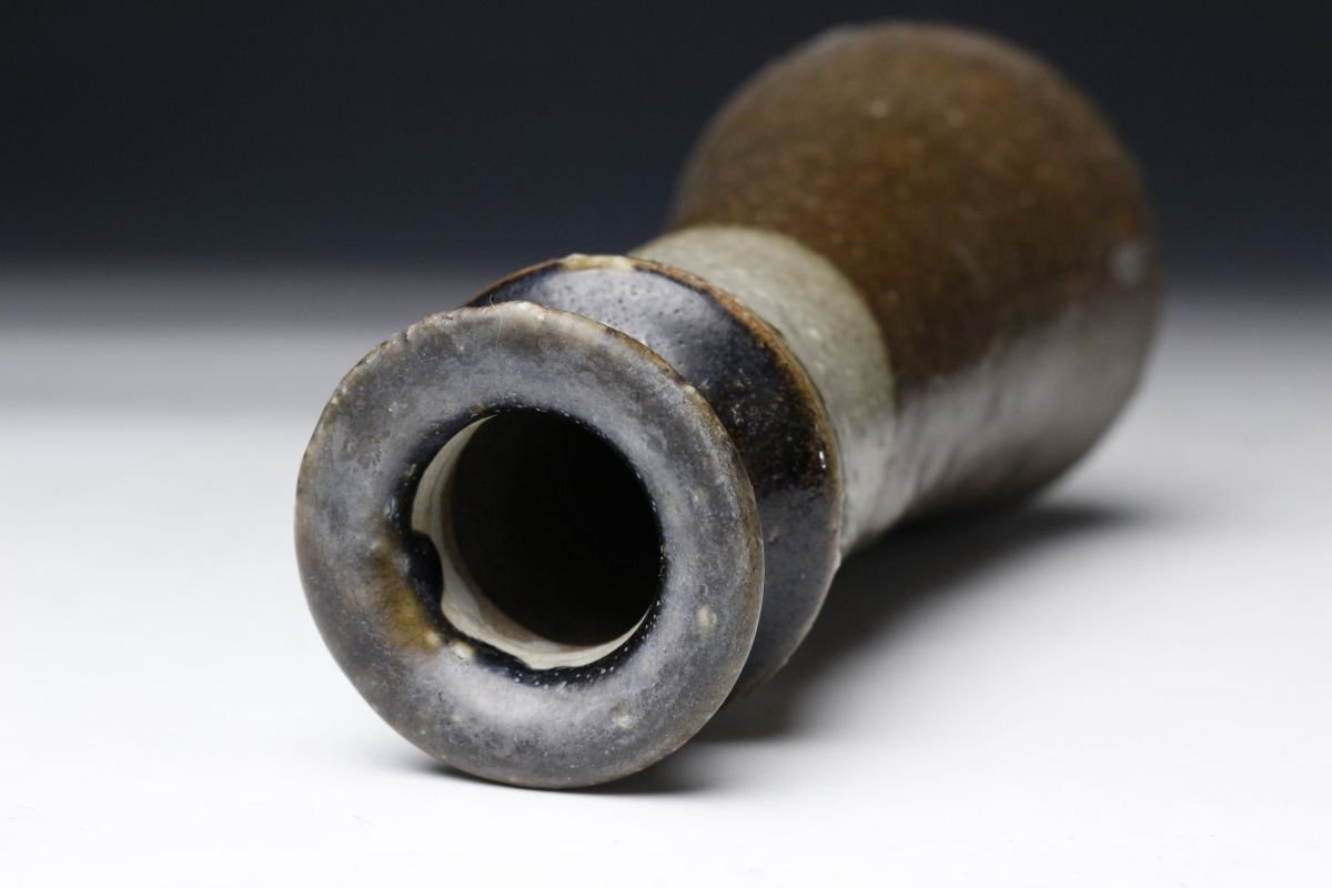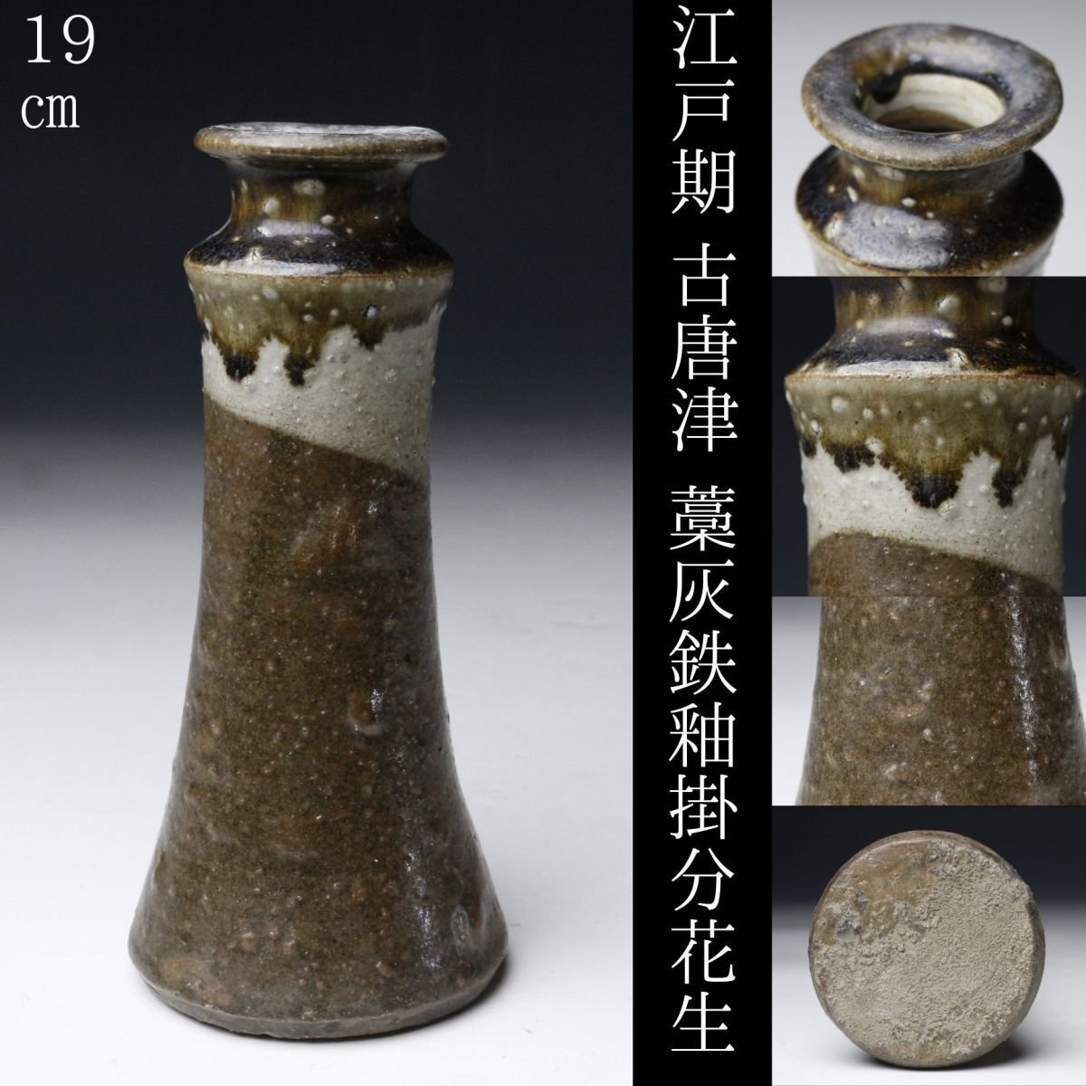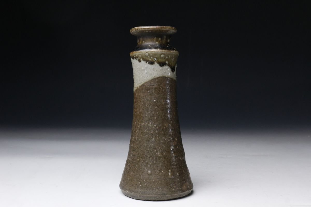 * * * 商品詳細 * * * ここでしか出逢うことのできない唯一の美をご紹介させて頂きます。 本作は、江戸時代に焼成された古唐津の花生で、藁灰釉・鉄釉・灰釉を巧みに掛け分けた、実に趣深い逸品です。 最も目を引くのは、釉薬の掛け分けによる美しい景色。胴部には温かみのある藁灰釉が掛けられ、ややざらりとした質感の中に自然な釉調の揺らぎが見られます。一方、首元には鉄釉と灰釉が重なり、深い飴色から灰白に変化する大胆なコントラストが生まれています。この釉境が首のあたりではっきりと分かれ、まるで一輪挿しとしての生命を宿したような表情を見せています。 手捻りの素朴な造形には、古唐津ならではの温もりと土味があり、控えめながらも力強い存在感を放ちます。 この機会に是非お手元にてご堪能ください。 ■商品内容/ 花瓶、箱 ■サイズ/横8.5cm×高19cm 箱:横11.5cm×高23.5cm×奥行11.5cm ■状態/ スレ、小傷、窯被、汚れがございます。 ※写真にてご確認、ご了承の上ご入札下さい。