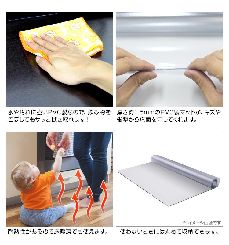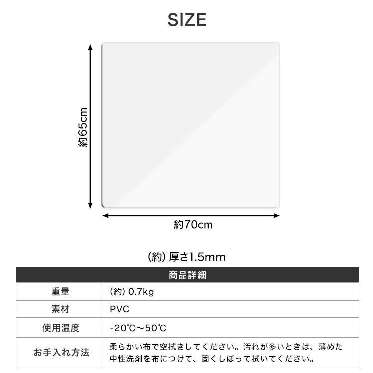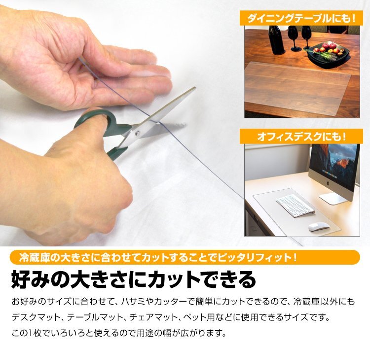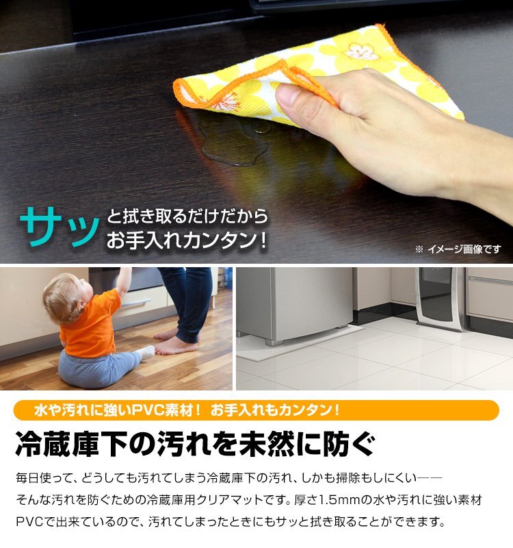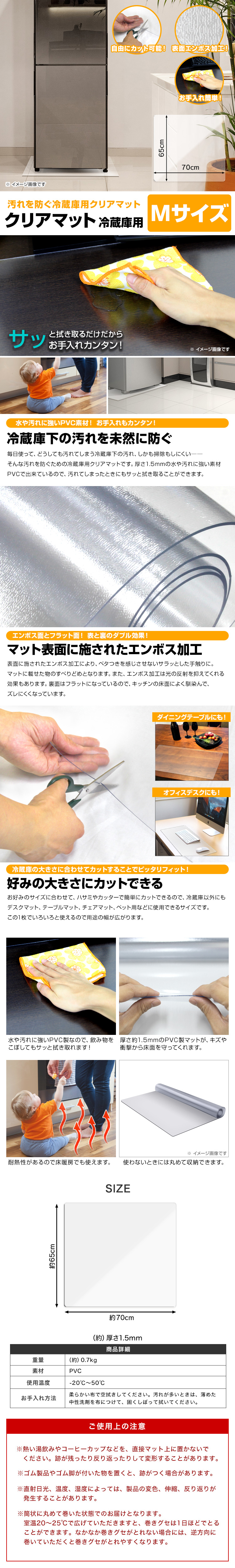 | 冷蔵庫の重みによるキズや凹みの防止する、冷蔵庫用クリアマットです! 汚れや水漏れによるカビ対策にもおすすめ!! 半透明のマットなので、お部屋の雰囲気を損ないません。 水や汚れに強い素材を使用! サッと拭き取るだけでお手入簡単☆ 気温や湿度などに対し変質や劣化を起こしにくい性質なので、 長期に渡って使用しても変形しにくいマットです。 また、お好みのサイズに合わせて、ハサミやカッターで自由にカット可能! 冷蔵庫以外にも家電、家具、ダイニングテーブル、オフィスデスク、チェア等 様々な汚れや傷から守るマットとして使用できます♪ 【商品仕様】 カラー:クリア サイズ(約):幅70cm×奥行65cm(厚さ1.5mm) 重量(約):0.7kg 材質:PVC 使用温度(約):-20℃~50℃ 【注意事項】 ・お手入れは柔らかい布で空拭きしてください。汚れが多い場合は、薄めた中性洗剤を布につけ、固く絞って拭いてください。 ・商品はモニターによって色合いが異なって見える場合があります。 ・仕様/デザインは改良のため予告なく変更することがあります。 (保護シート 保護マット マット クリア 冷蔵庫 二人暮らし 冷蔵庫の下に敷くマット 人気 安い) |