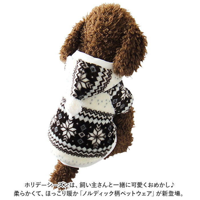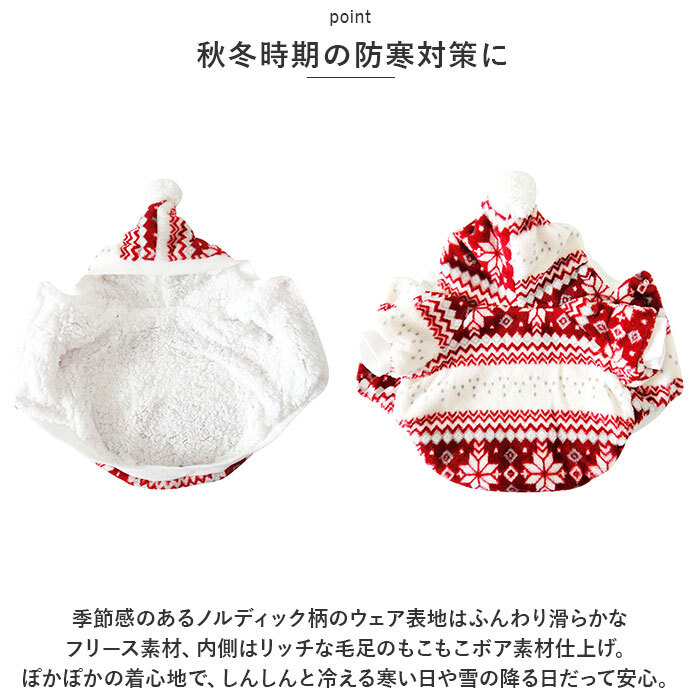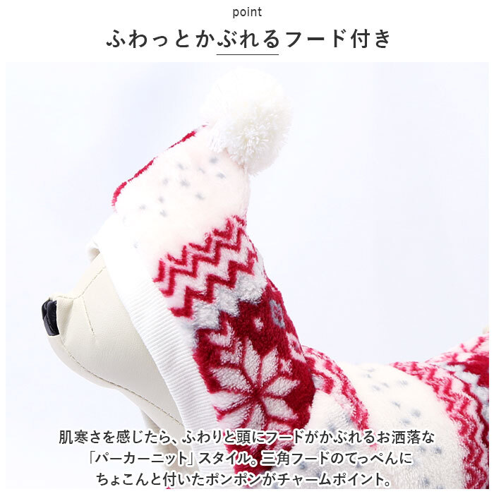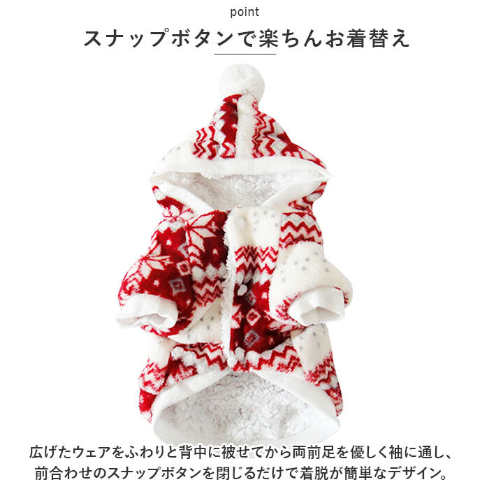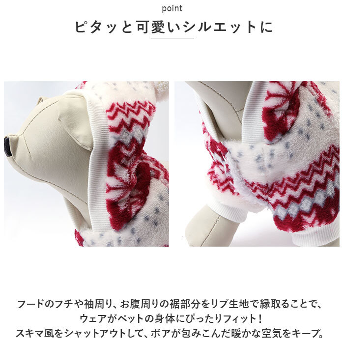 | 商品説明 | ・・ホリデーシーズンは、飼い主さんと一緒に可愛くおめかし♪柔らかくて、ほっこり暖か「ノルディック柄ペットウェア」が新登場。 ・【秋冬時期の防寒対策に】 ・季節感のあるノルディック柄のウェア表地はふんわり滑らかなフリース素材、内側はリッチな毛足のもこもこボア素材仕上げ。ぽかぽかの着心地で、しんしんと冷える寒い日や雪の降る日だって安心。 ・【スナップボタンで楽ちんお着替え】 ・広げたウェアをふわりと背中に被せてから両前足を優しく袖に通し、前合わせのスナップボタンを閉じるだけで着脱が簡単なデザイン。 ・【ふわっとかぶれるフード付き】 ・肌寒さを感じたら、ふわりと頭にフードがかぶれるお洒落な「パーカーニット」スタイル。三角フードのてっぺんにちょこんと付いたポンポンがチャームポイント。 ・【ピタッと可愛いシルエットに】 ・フードのフチや袖周り、お腹周りの裾部分をリブ生地で縁取ることで、ウェアがペットの身体にぴったりフィット!スキマ風をシャットアウトして、ボアが包みこんだ暖かな空気をキープ。 ・【おトイレの時も安心】 ・お腹周りやお尻は大きく開いたデザインなので、おトイレで生地を汚す心配がないのも嬉しいポイント! ・【ピッタリサイズをチョイス!】 ・XSサイズからXLサイズまでの5つのサイズから、ぴったりサイズがチョイス可能!超小型犬から、胴回り53cm程度までの小型~中型のワンちゃんに最適なサイズ感。小さなサイズはネコちゃんにもオススメ。 ・【ルームウェアにも◎】 ・肌寒さが気になる季節のお散歩用ウェアとしてはもちろん、ルームウェアやパジャマとして、朝晩の冷え込み対策にもオススメ。 ・【ペットとの記念撮影に】 ・ホリデーシーズンを暖かな色彩で彩る、雪の結晶をモチーフにしたノスタルジックなカラーバリエーション。クリスマスパーティーやお正月など、ご家族とペットとの記念撮影にピッタリのデザイン。 |