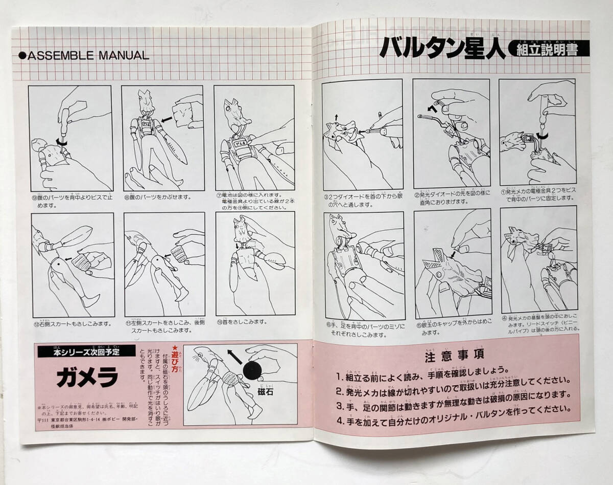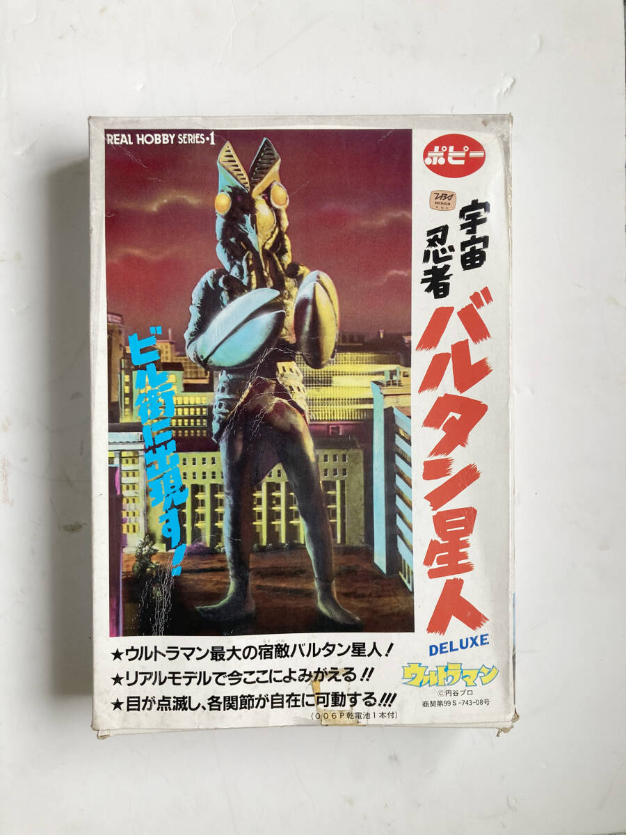 ブリスターの中に電池が入ってますが、粉吹きや液漏れは無いようなのでそのままです(古いので使えないと思います) バルタン星人の解説付き取説が入ってます。
