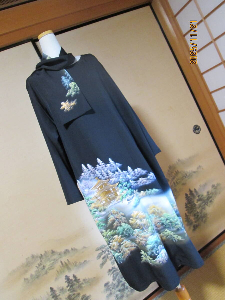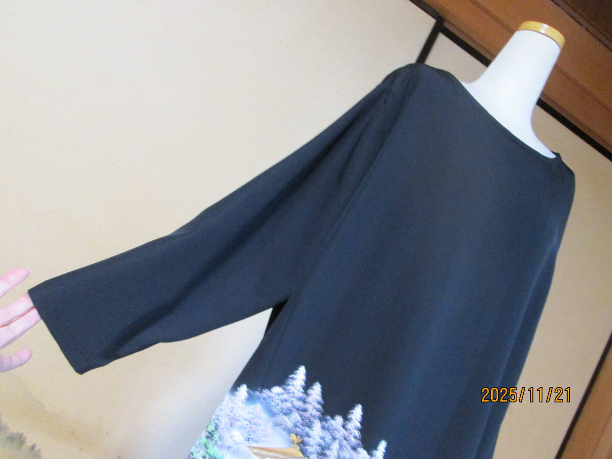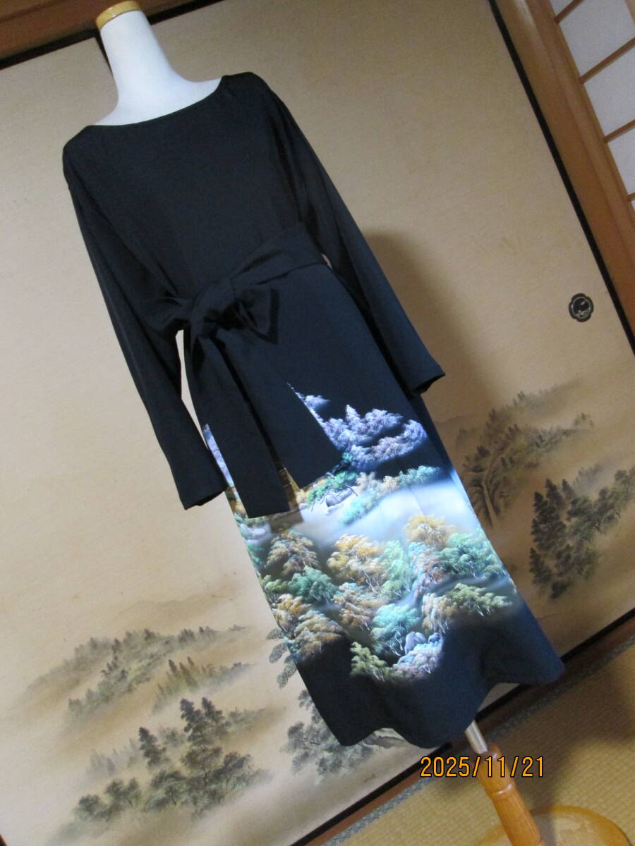 新品未仕立ての正絹黒留袖からワンピース&細共布ベルト2点セットにリメイクしました。