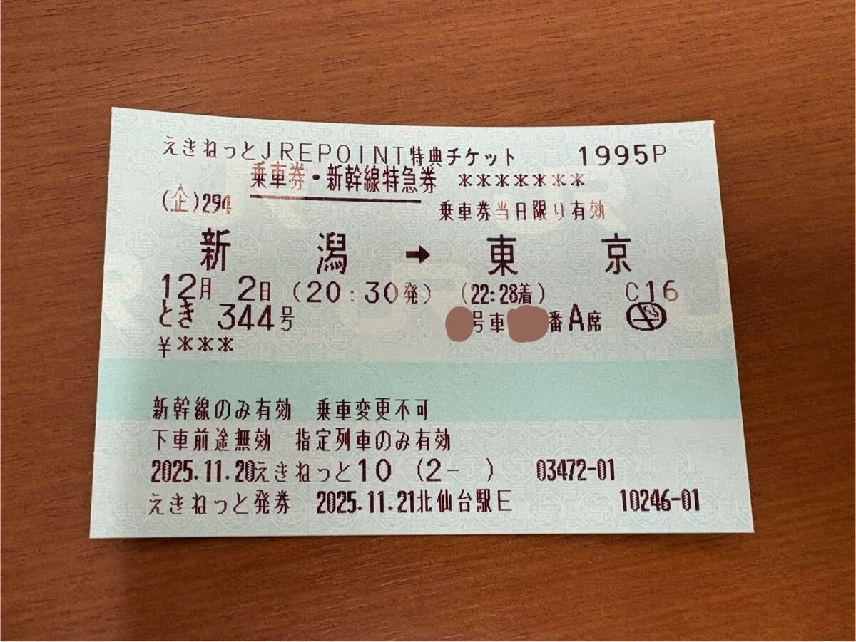 新幹線の特急券・乗車券です.12/2(火)のとき344号に燕三条→上野まで1名乗れます.
