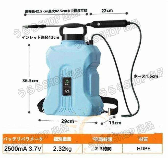 【作業量と効率性をアップ】12L大容量タンクの全自動噴霧器として、手動式・蓄圧式に比べ、ボタンを押すだけで作業ができ、2500MAリチウムバッテリー付きで、長時間作業を支えます。これによって、負担軽減や時間短縮が実現し、大量や大面積の作業を素早く簡単に済めます。
