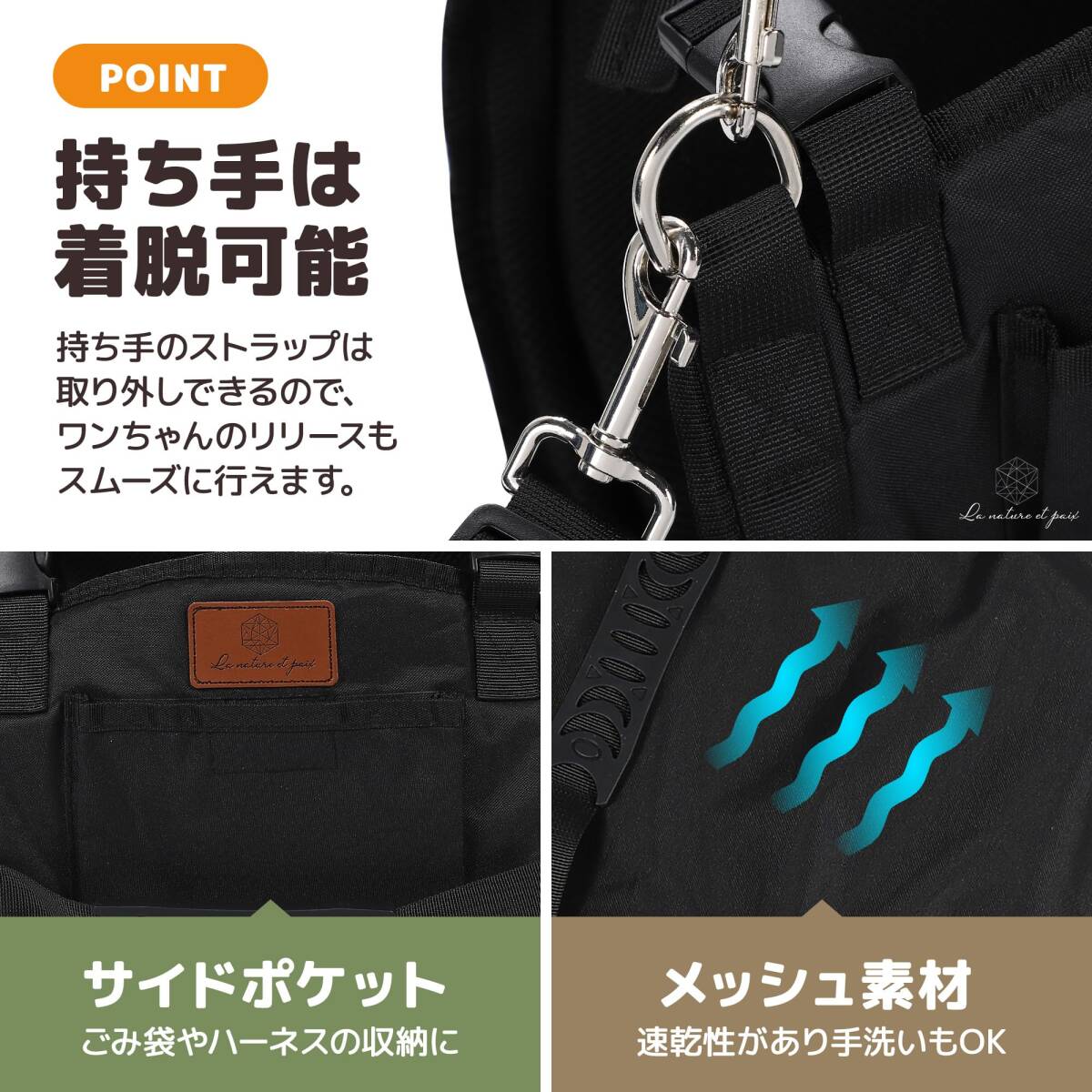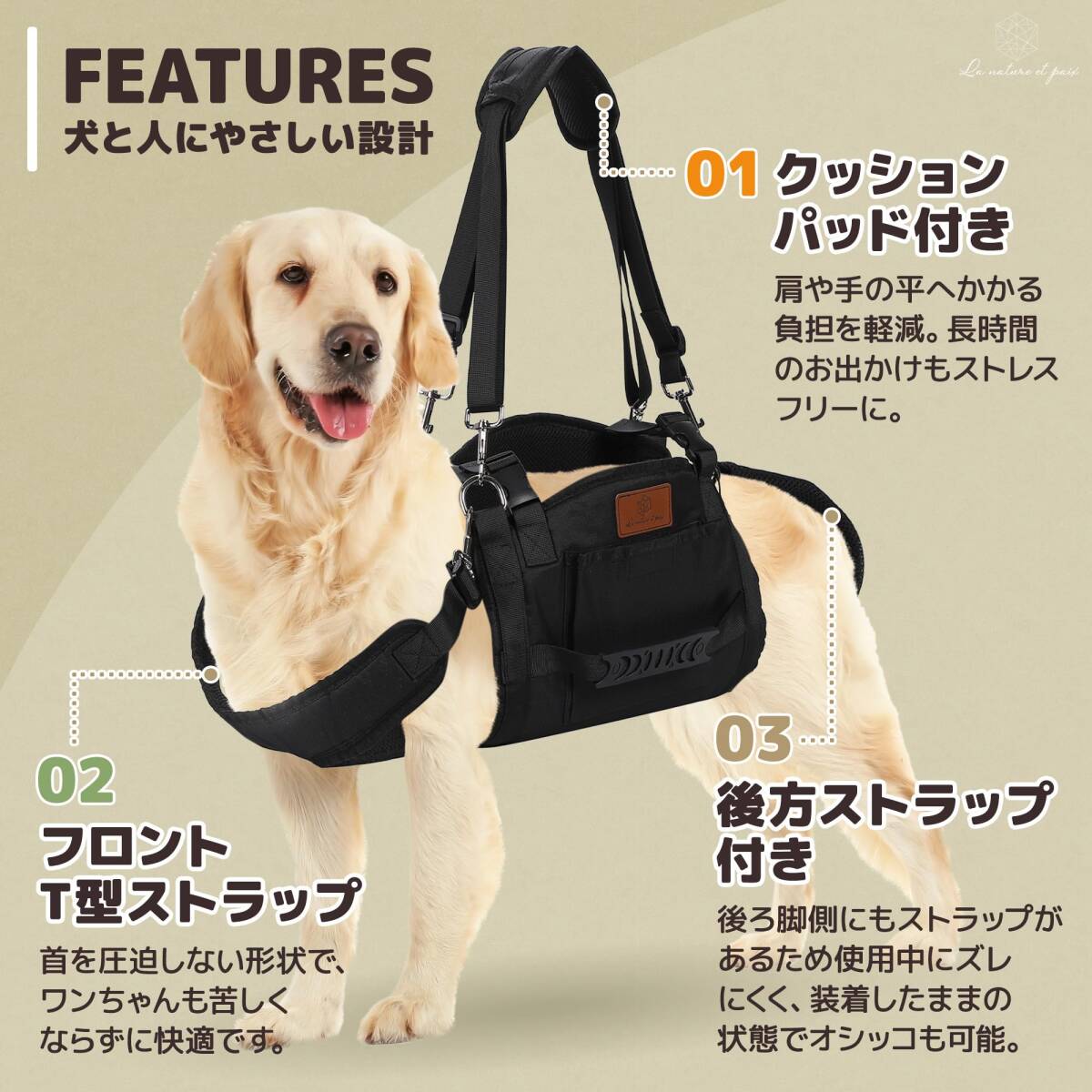 【ワンちゃんにやさしいハーネス】フロントT型ストラップのハーネスは首を圧迫しない形状で、使用中にワンちゃんも苦しくならず快適。後ろ脚側にもストラップがあるため使用中にズレにくく、装着したままの状態でオシッコも可能です。 【製品の特長】《着脱可能な持ち手》ワンちゃんのリリースもスムーズに行えます。《サイドポケット付き》ごみ袋やハーネスの収納に。《メッシュ素材》速乾性があり手洗いにも対応。《クッションパッド付き》肩や手の平へかかる負担を軽減します。《調節可能》バックルとストラップで長さを調節できます。 【デザイン】どんな犬種のワンちゃんでも使いやすい、ブラックを基調としたシンプルで洗練されたデザインのハーネスです。サイドにはブランドロゴが刻印されたタグ付きで、高級感も抜群。 【ご利用シーン】階段の上り下りの補助に/ワンちゃんの普段のお散歩に/車の荷台などの乗り入れに/爪切りやカットの際に/老犬介護用のアイテムとしして【商品仕様】○サイズ:M/L/XL/XXL ○カラー:ブラック ○素材:メッシュ素材 ○ブランド:La nature et paix 介護 ハーネス 犬 大型犬 ハーネス 介護