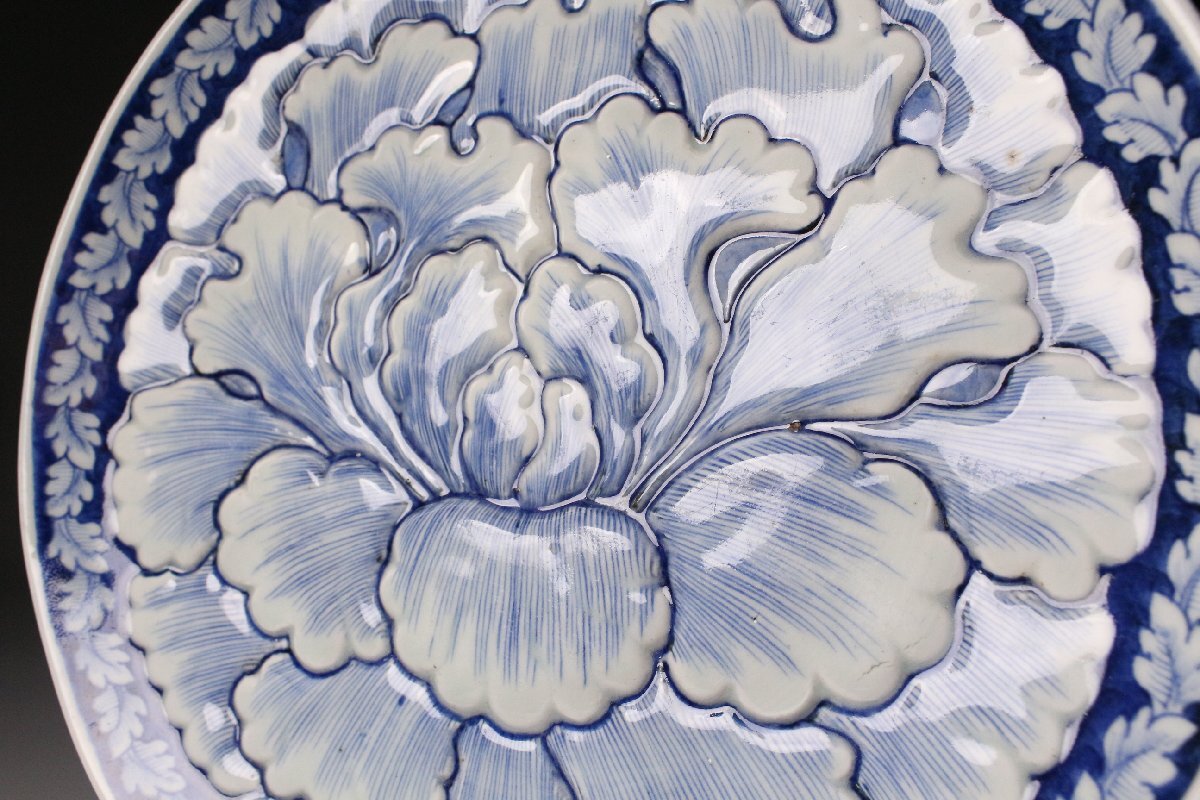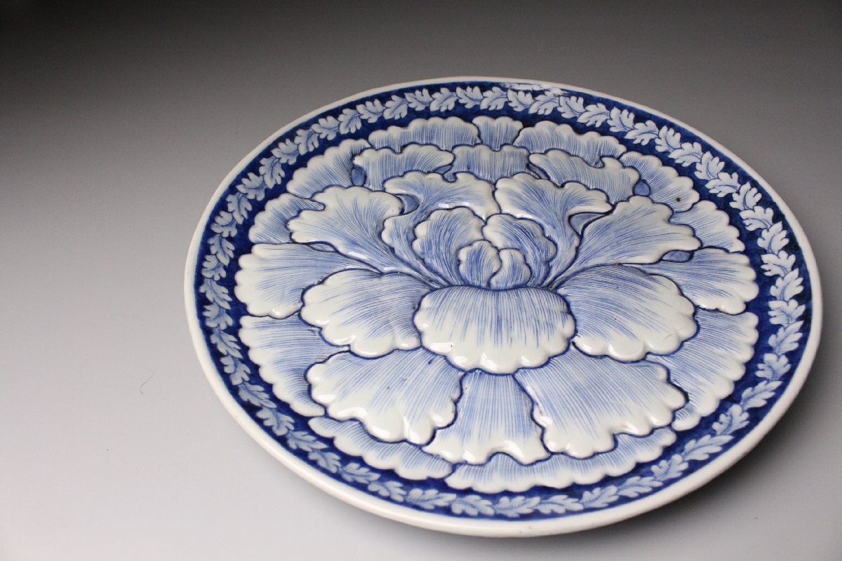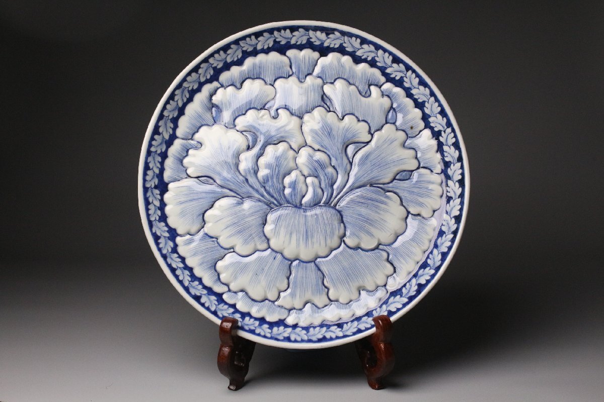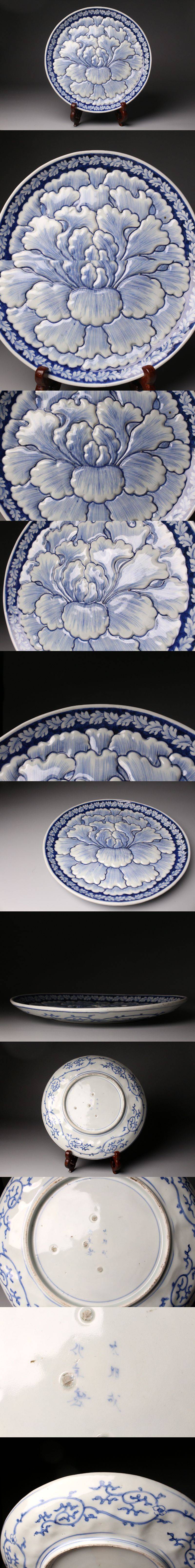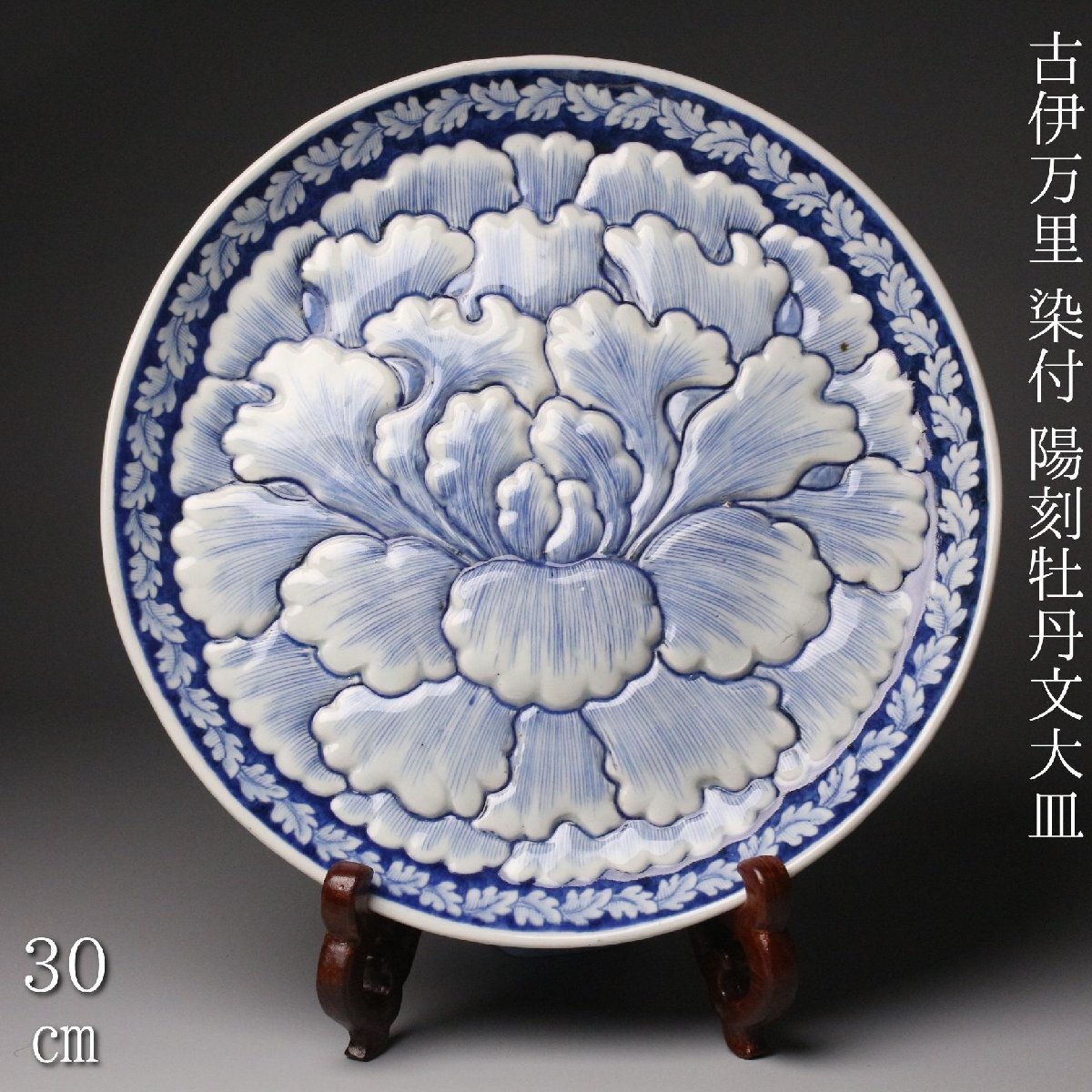 * * * 商品詳細 * * * ここでしか出逢うことのできない唯一の美をご紹介させて頂きます。 直径30cm、堂々たる姿で魅せる古伊万里・染付の陽刻牡丹文大皿。 画面いっぱいに施された牡丹の陽刻は、まさに浮かび上がるような立体感をもち、 光のあたり方で陰影が際立ち、染付の藍と共に優美な景色を生み出しています。 陽刻によって添えられた力強さと、染付の柔らかな筆致が見事に調和し、 ただの装飾を超えて、器全体が華やぎを帯びたような存在感を放ちます。 古伊万里の美を存分に楽しみたい方に、ぜひ手に取っていただきたい作品です。 ■サイズ/横30㎝×高3.5㎝ ■状態/経年による スレ、小傷、汚れがございます。 ※写真にてご確認、ご了承の上ご入札下さい。 ※皿立ては付属致しません。