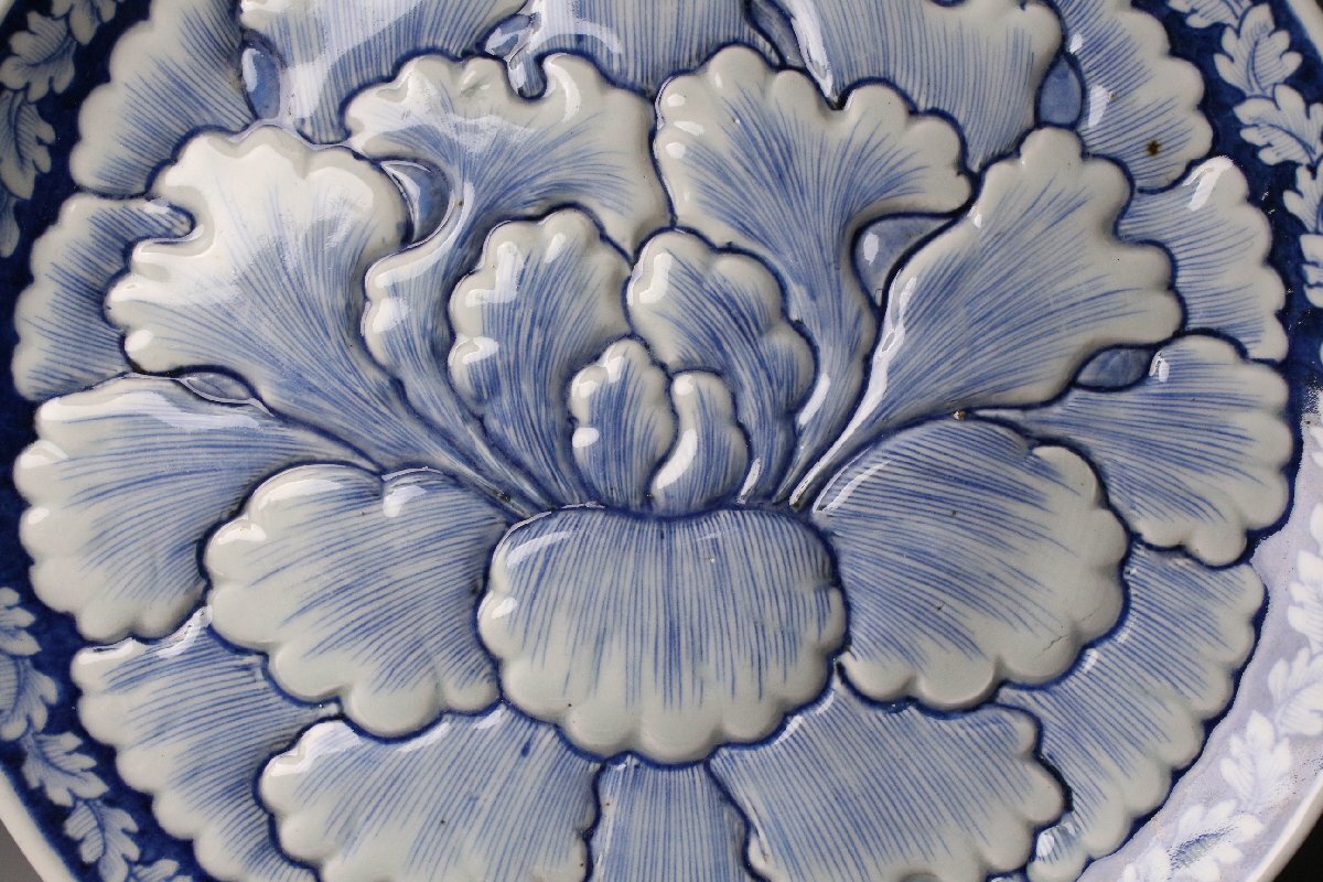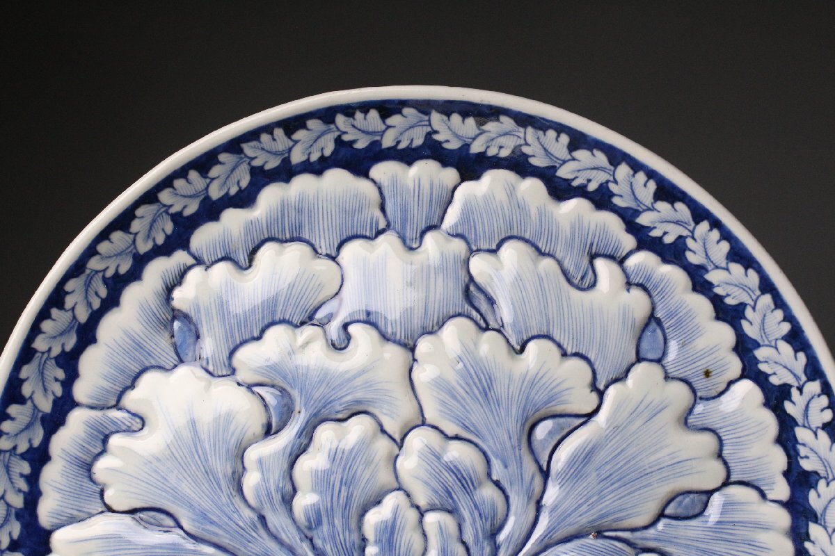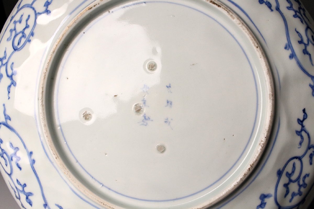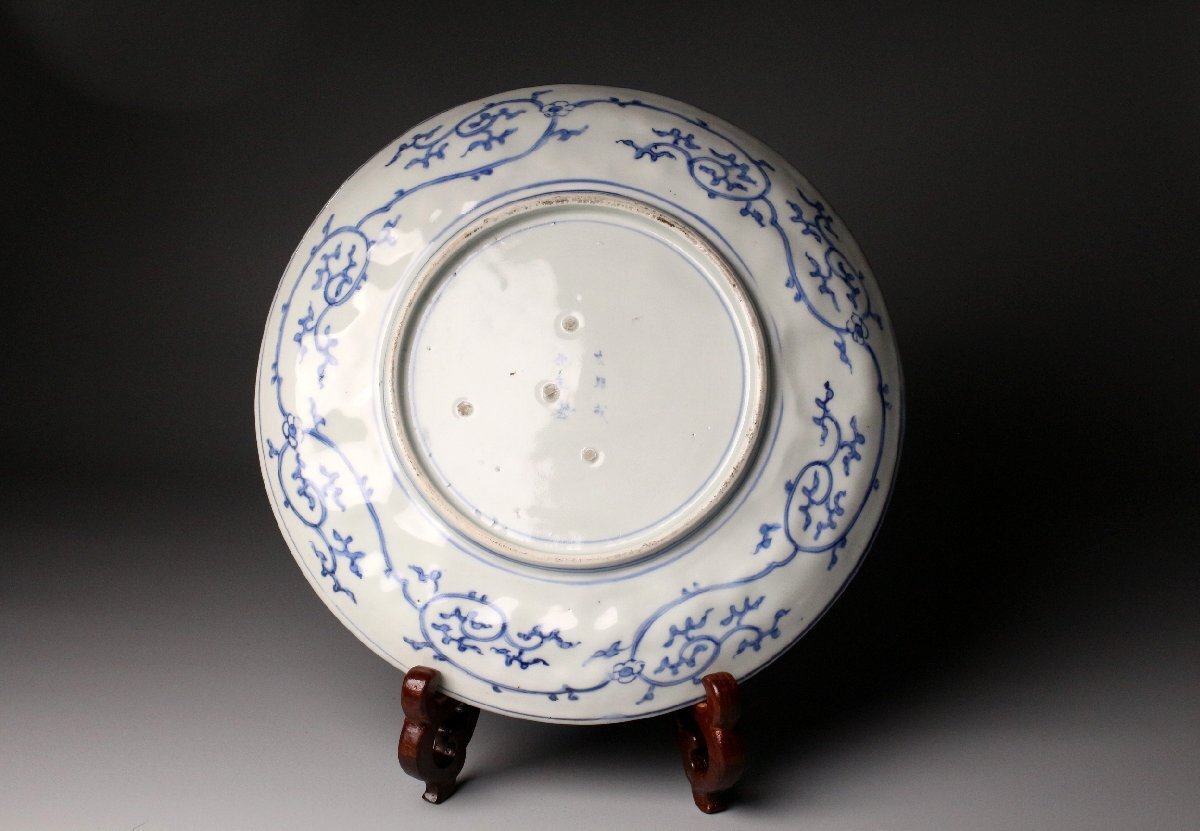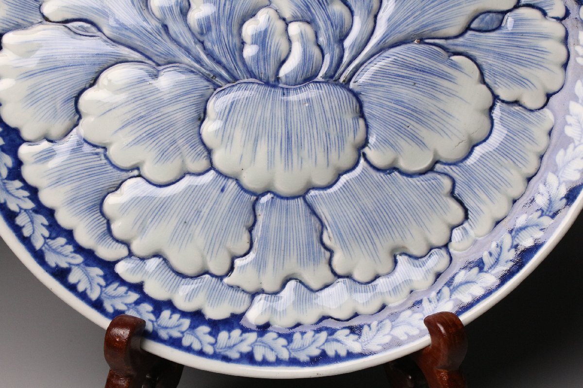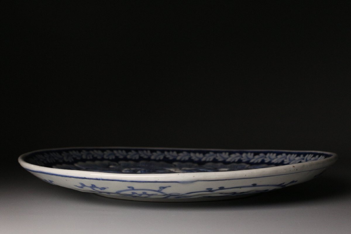 * * * 商品詳細 * * * ここでしか出逢うことのできない唯一の美をご紹介させて頂きます。 直径30cm、堂々たる姿で魅せる古伊万里・染付の陽刻牡丹文大皿。 画面いっぱいに施された牡丹の陽刻は、まさに浮かび上がるような立体感をもち、 光のあたり方で陰影が際立ち、染付の藍と共に優美な景色を生み出しています。 陽刻によって添えられた力強さと、染付の柔らかな筆致が見事に調和し、 ただの装飾を超えて、器全体が華やぎを帯びたような存在感を放ちます。 古伊万里の美を存分に楽しみたい方に、ぜひ手に取っていただきたい作品です。 ■サイズ/横30㎝×高3.5㎝ ■状態/経年による スレ、小傷、汚れがございます。 ※写真にてご確認、ご了承の上ご入札下さい。 ※皿立ては付属致しません。