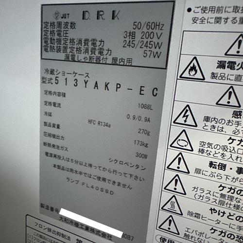 冷蔵リーチインショーケース 大和冷機 513YAKP-9EC 業務用 中古/送料別途見積
