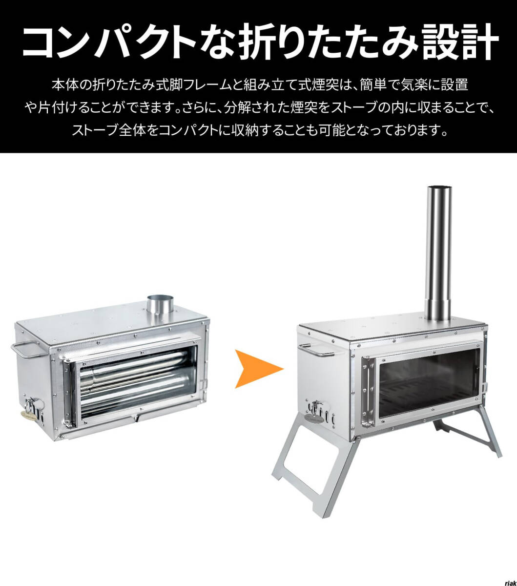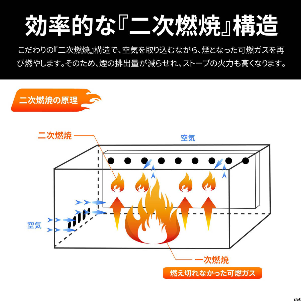 特徴:耐熱ガラス窓付き、二次燃焼構造、コンパクト収納、収納袋付き