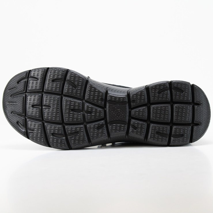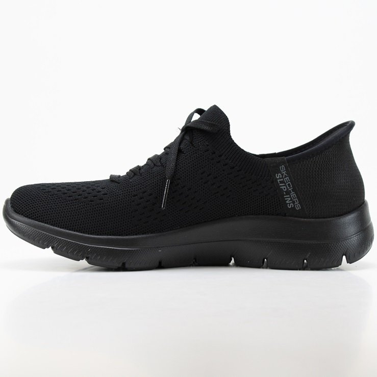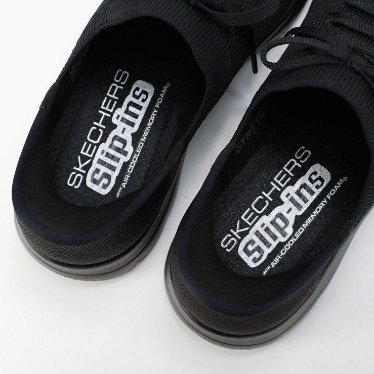 立ったままハンズフリーで靴の脱ぎ履きが可能なSLIP-INSモデル。飾り紐がついた伸縮性のあるストレッチ素材のアッパー。洗濯機で丸洗い可能。クッション性に優れたSkechers Air-Cooled Memory FoamRインソールを搭載。