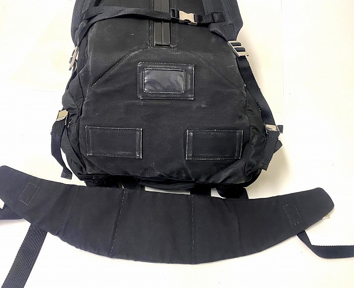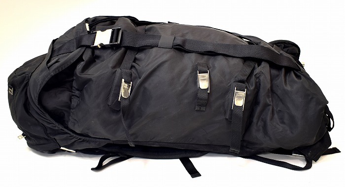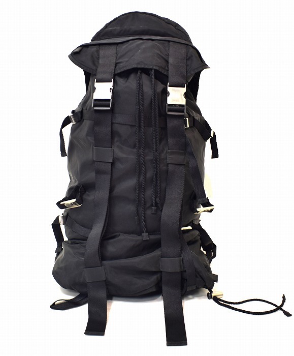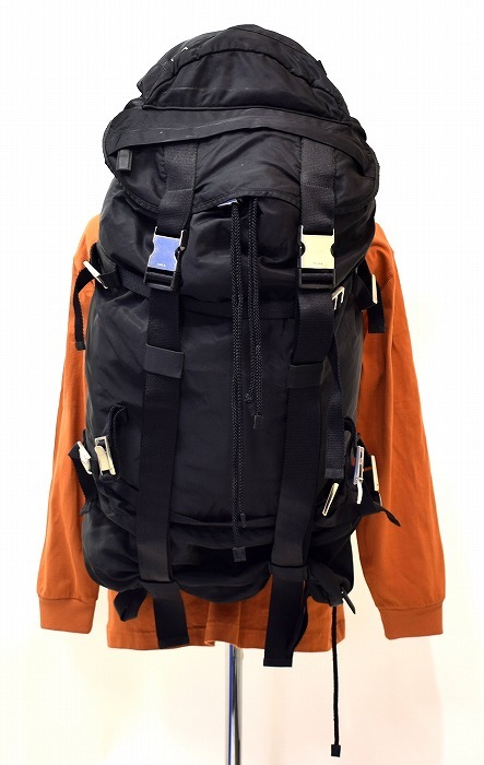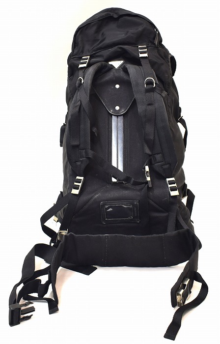 ・素材: ナイロン ・カラー: ブラック ・サイズ: 実寸を参考にしてください 実寸(平置きにして)ヨコ 約36cm・高さ 約78cm・マチ 約27cm(正確には測りにくいため多少の誤差はお許しください) 1970年代から続く「PRADA」の代名詞ともいえる「テスートナイロン(ポコノ)」シリーズ。 こちらはその中でも人気の高いバックパック型 V134 モデルです。 上品な光沢感と軽さ、使い勝手の良さを兼ね備えた名作。 ユニセックスで使える万能デザインで、大荷物でも安心の大容量。 伝説的なモデル「V134」のバックパックは近年のアーカイブブーツで再評価が高まっている、非常に人気の高い大型リュック。 バックパック下部にはサイドからアクセスできる独立した仕切りがあり、シューズや濡れたものなど分けて収納するのに非常に便利です。 ラグジュアリーブランドでありながら、本格的な登山用パックのような機能美を備えたPRADAの歴史的名作です。 1週間くらいの旅行にも重宝しそうです。 本体と保存袋のみ ヴィンテージアイテム特有の使用感があります(NCNR)。 それはあえてラフに使いこなす上級者としての雰囲気として現在のトレンドにマッチしています。 金具に打刻 スレ、生地にアタリ、スレ、うす汚れがみられます。 使用に影響があるような破れはありません。 まだまだタフに使っていただけます。 ※ウエストベルト固定用のプレートが欠損しています(画像参照)。 ただし、大容量のためウエストベルトを使用しなくても、十分なホールド感があり、普段使いや旅行用としては全く問題なく使用していただけます。 使い込んだ風合いと大容量の実用性をぜひ、あなたの日常に取り入れてみてください。 ラグジュアリーブランドをあえてタフに使いたい方におすすめです。 かなりお値打ちだと思います。この機会にぜひ!(NCNR) 他にもいろいろ出品しています。 管理番号: MYS-01121 |