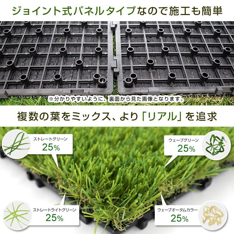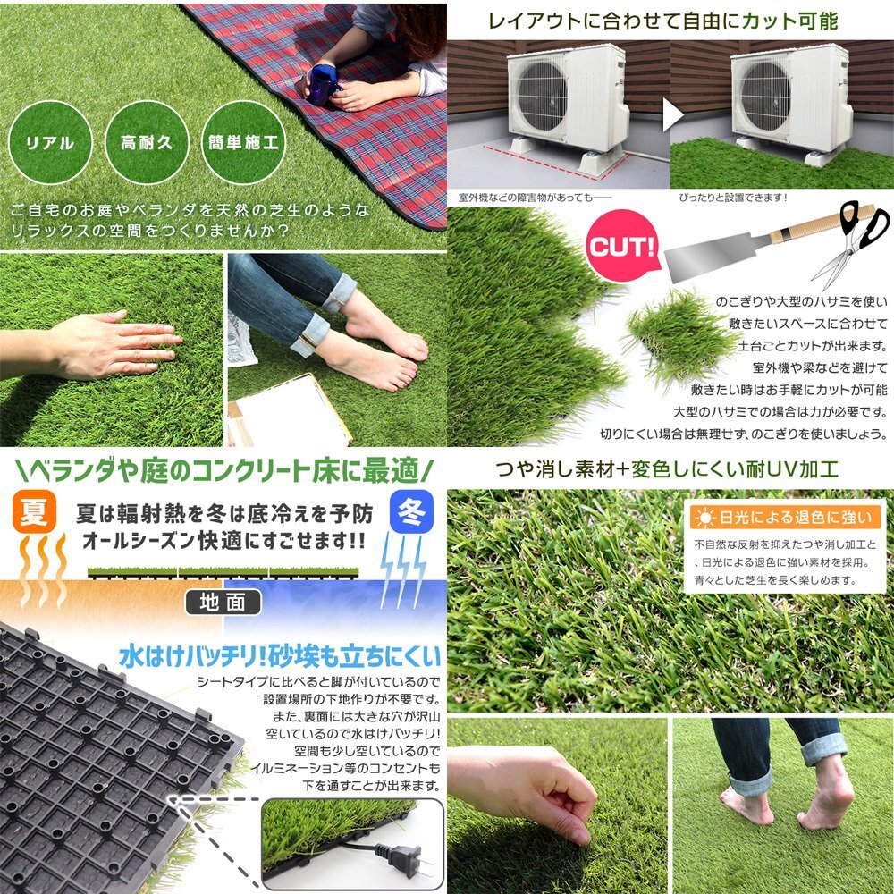 素足で歩きたくなるやわらかさ。 本物の天然芝と見間違えるほどのリアル感! パネルタイプの人工芝です。 ジョイント式で簡単設置! 人工芝なので枯れる心配も無ければ、メンテナンスもほぼ不要。 年間を通してきれいな緑が素晴らしい景観を保ちます。 水抜き穴が空いているので水が溜まる心配はありません。 屋外用の照明やイルミネーションなどの配線を裏面の隙間に通すことも可能です。 のこぎりや園芸用の大型ハサミでカットできるので自由に配置も可能です。 ジョイント式タイプのものと組み合わせ自由♪ 大切なお庭のアレンジにぜひお役立てください♪ 【商品仕様】 ●内容 人工芝パネル × 9 ●サイズ 人工芝部分の寸法:(約)幅29.5cm×長さ29.5cm×高さ3cm ジョイント部分を含めた寸法:(約)幅30.5cm×長さ30.5cm×高さ4cm ●重量 1枚あたり:(約)0.35kg ●適用箇所 屋外(テラス、バルコニー、庭等) 【注意事項】 ・海外製品のため多少の傷、汚れがある場合がございますがご了承ください。 ・商品は、モニターによって色合いが異なって見える場合があります。 ・仕様・デザインは改良のため予告なく変更することがあります。 保証期間 7日 ※使用開始時期や使用期間に関わらず、お買い上げ日から7日間です。 商品到着後から7日を過ぎますと、交換の際の往復送料はお客様負担となりますのでご了承ください。 場合によっては対応出来ないケースもございます。 |