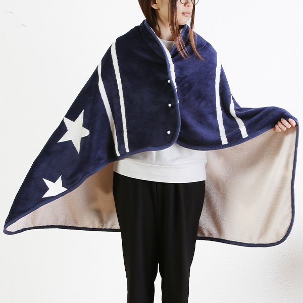 大判ブランケット 140×103cm ひざ掛け 腰巻き フランネル リバーシブル ボタン付き お洒落 洗える 毛布 ケット 防寒 スターネイビー