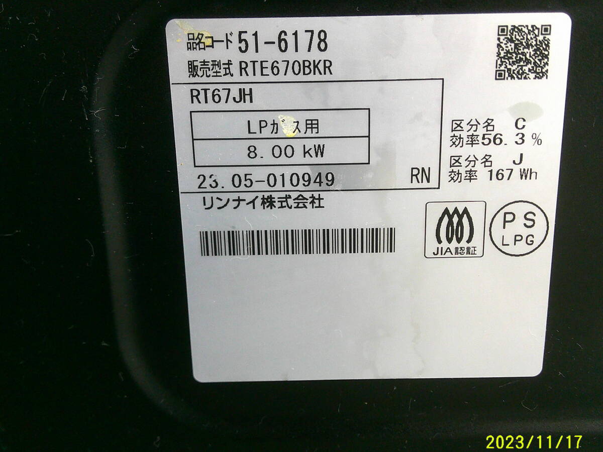 CH-11-35 リンナイ ガスコンロ LPガス用 RT67-JH 2023年製 平日のみ直引取可
