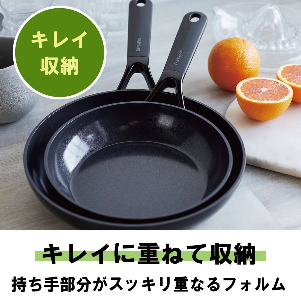 ・初めてセラミックコーティングを使ってみる方にお勧めのシリーズ ・底面が広いので、一度に沢山調理ができる ・ハンドルのV字部分もセラミックコーティングがされているのでお手入れも簡単 ・収納する際、フライパン同士がキレイに重なるスリムなデザイン ・内側にハンドルを接合するリベットが無いのでお手入れも簡単 ・グリーンパンは、フッ素樹脂を使用しないノンスティックコーティングを用いた調理器具を世界で初めて発売した、ベルギー発のメーカー ・グリーンパンを製造している自社工場では、さまざまな環境改善のための取り組みを行っており、環境にも優しいクックウェア。