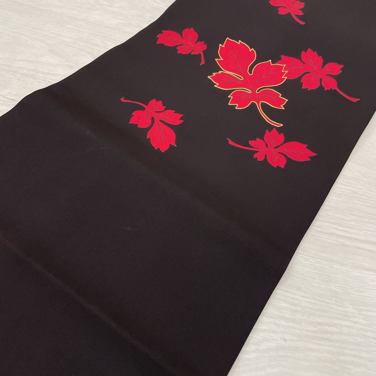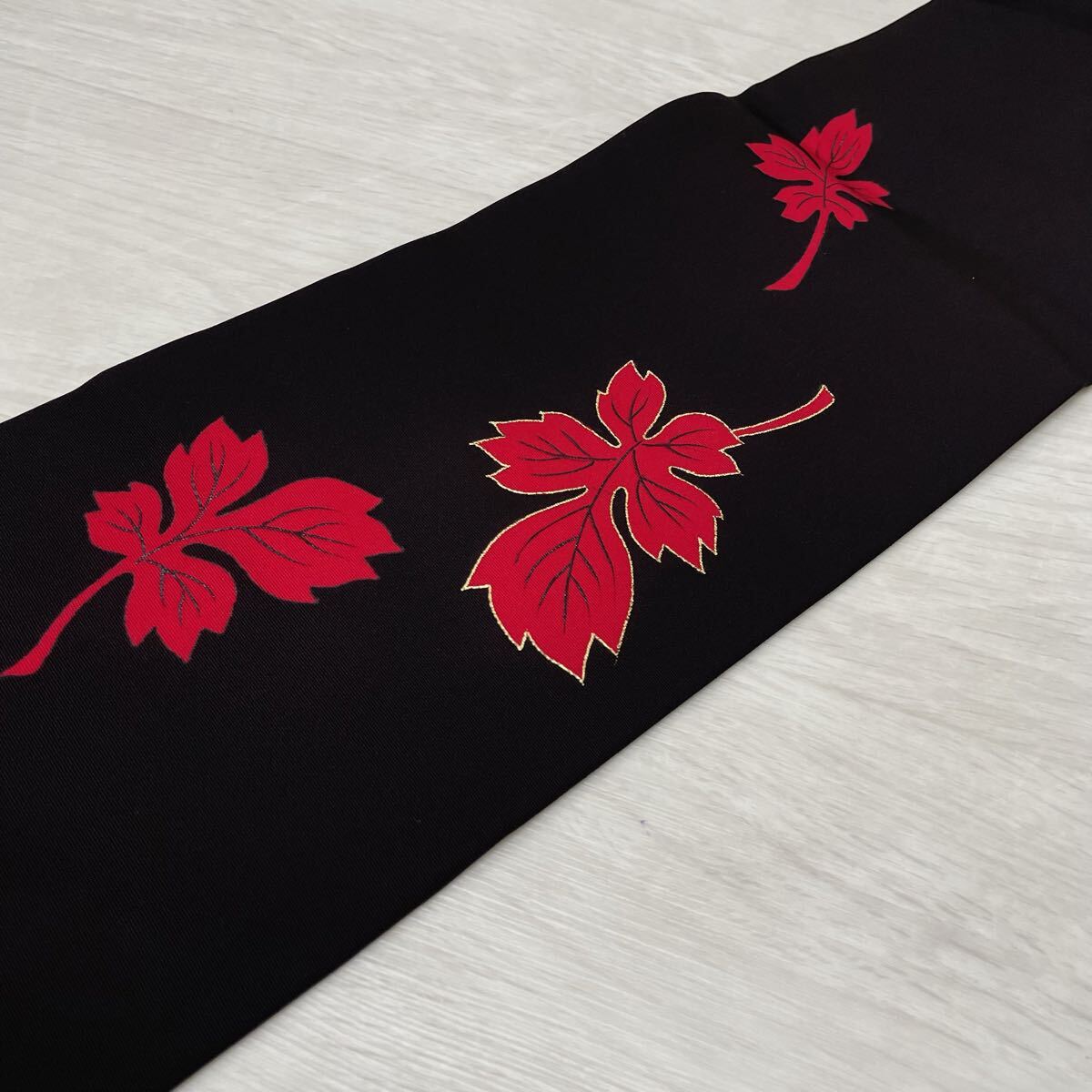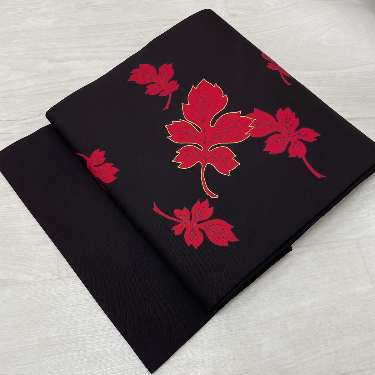 名古屋帯 塩瀬 黒地に鮮やかな赤の楓 九寸 正絹 着物 W-6885