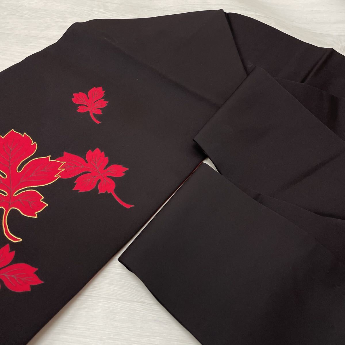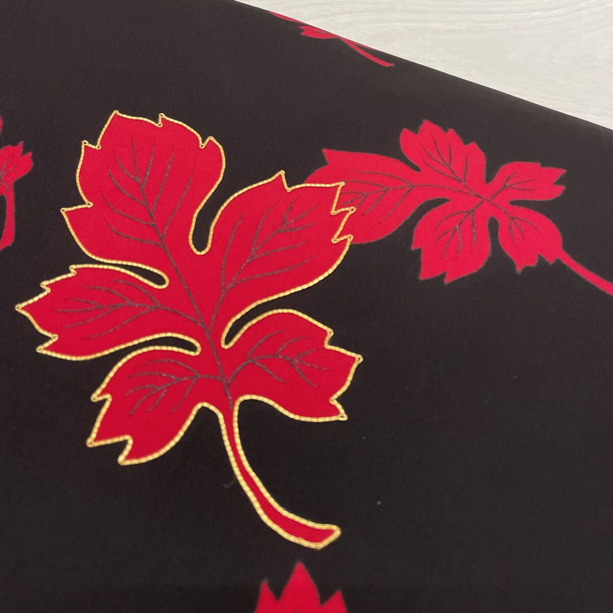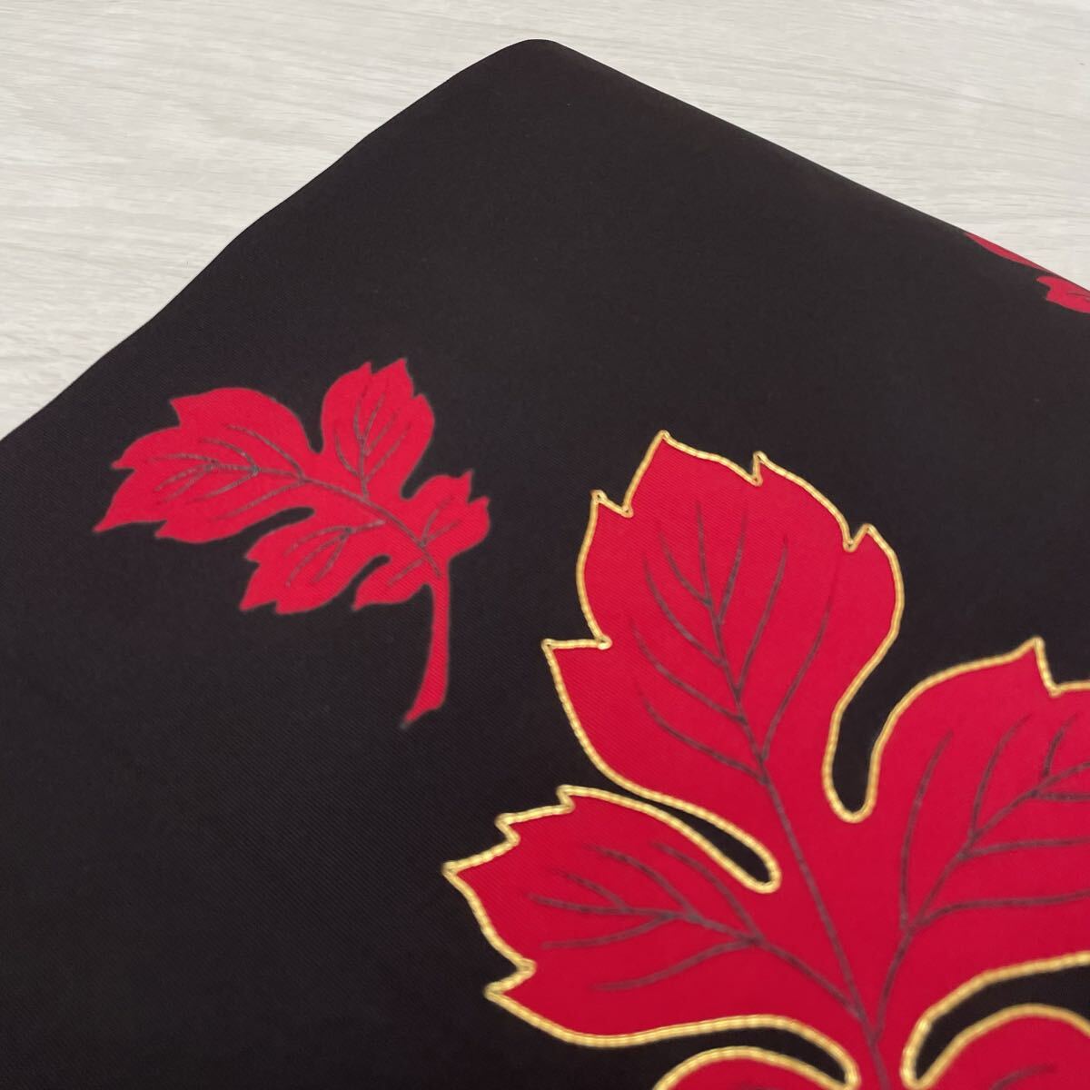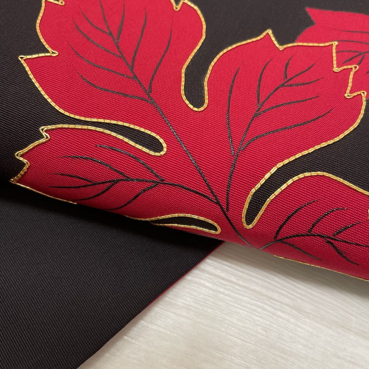 名古屋帯 塩瀬 黒地に鮮やかな赤の楓 九寸 正絹 着物 W-6885