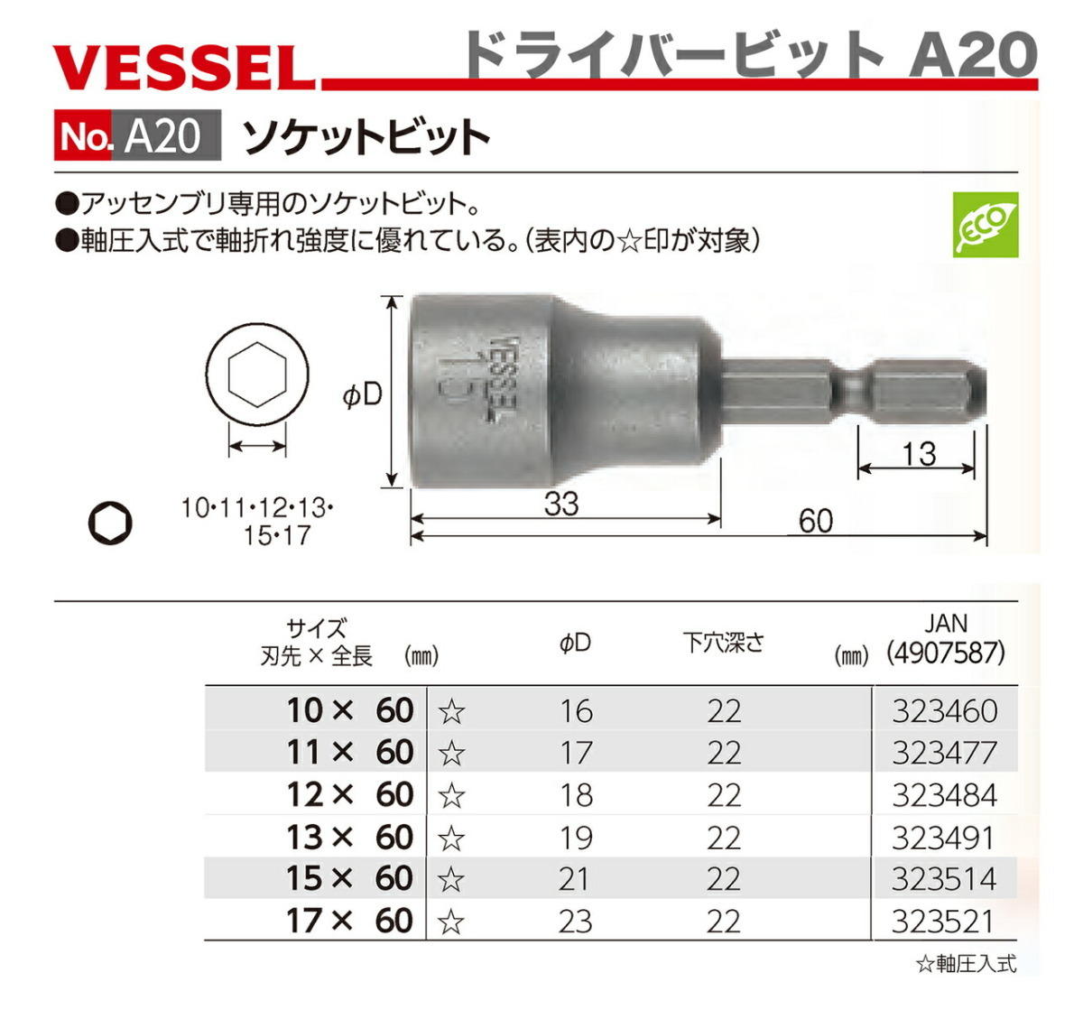 〈ベッセル〉ドライバービット A20 13×60 JAN:4907587323491