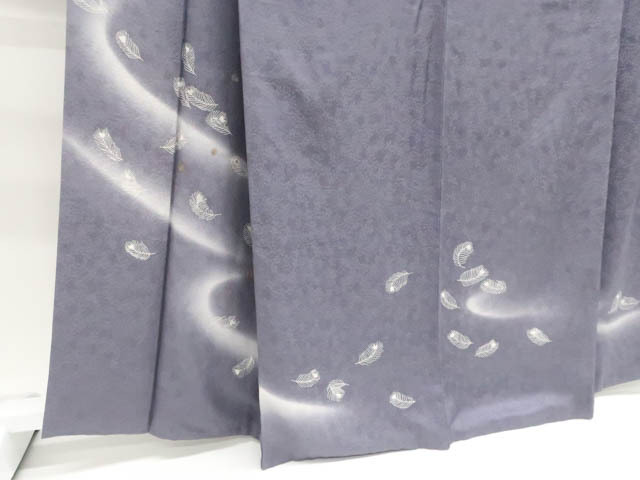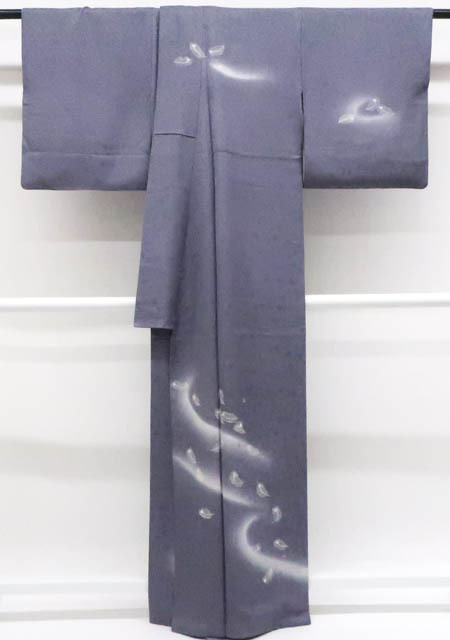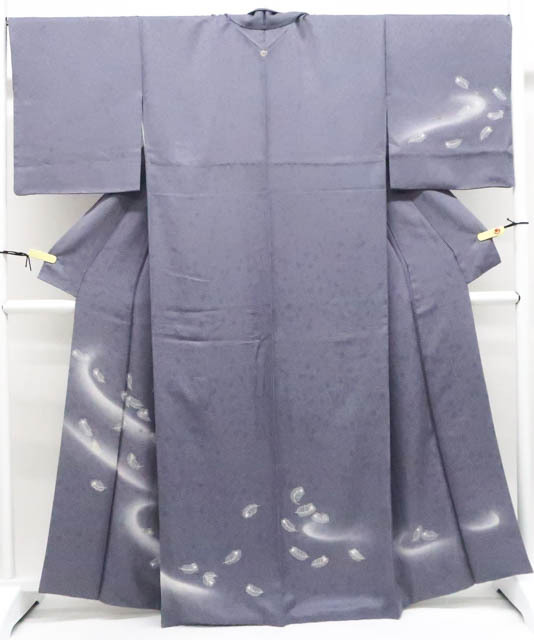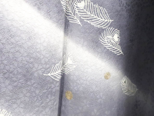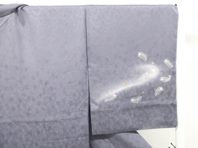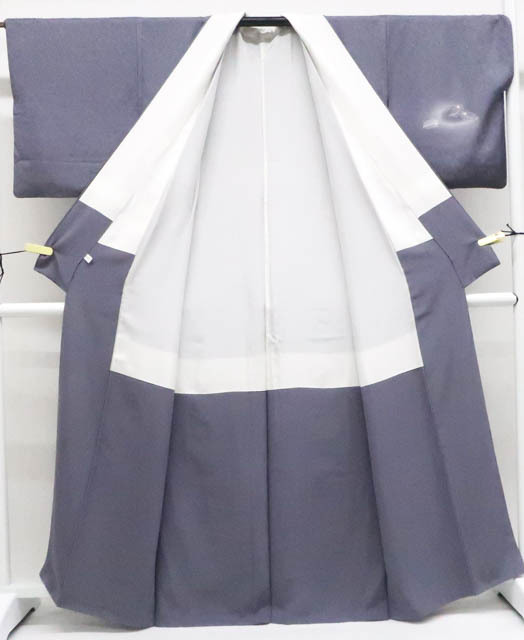 リサイクル商品のため、右袖前に薄汚れ、衿折れ山に汚れがございますが着用可能なお品です。 地色は灰紫です。 1枚目の画像が近いお色かと思われます。 素材は正絹です。 |