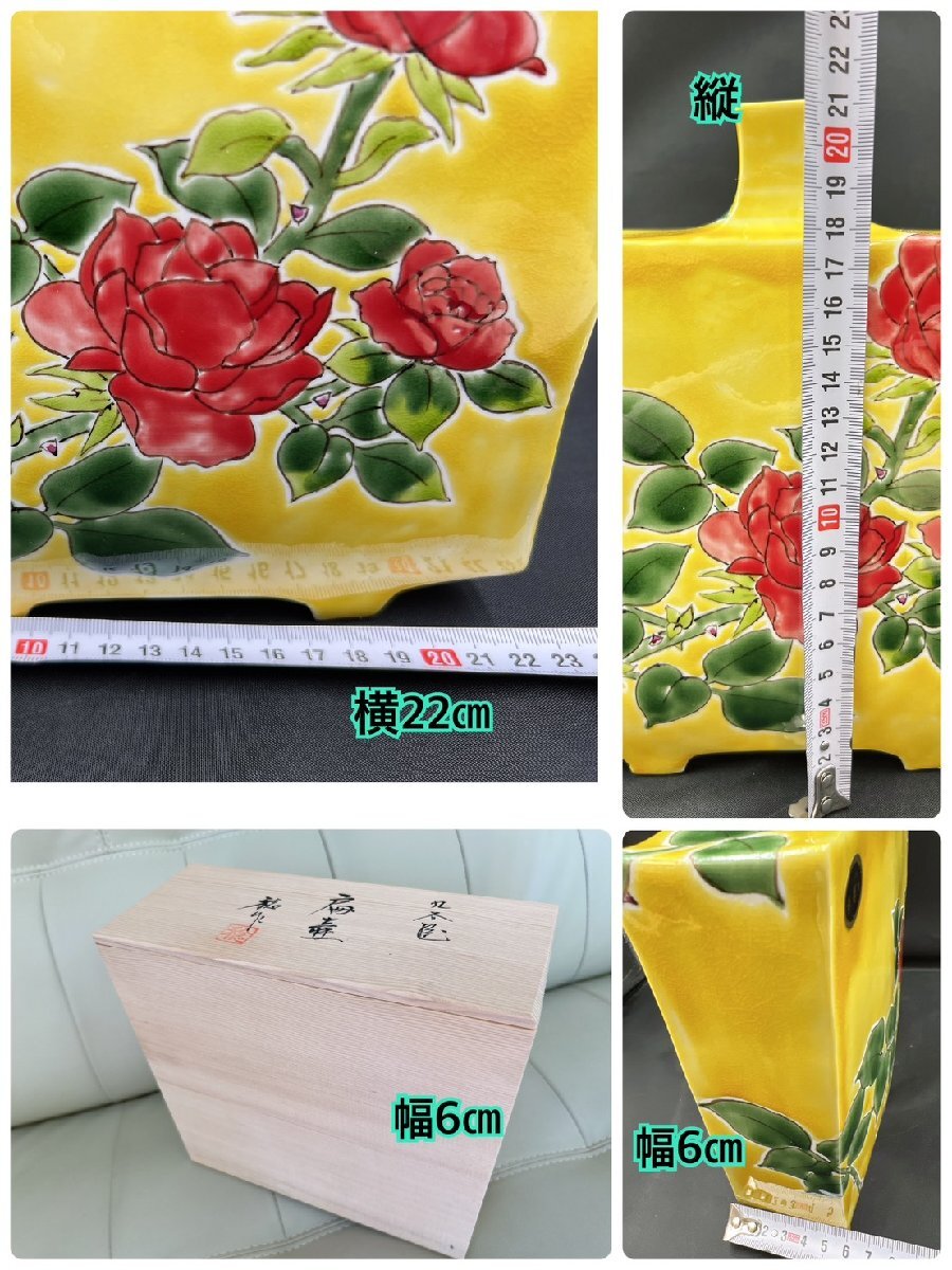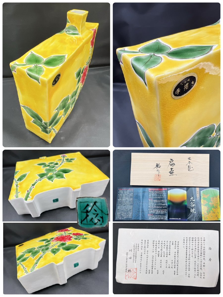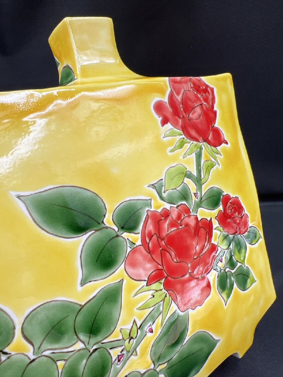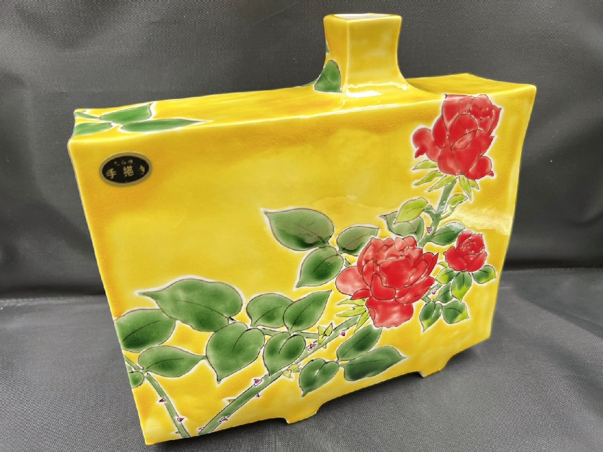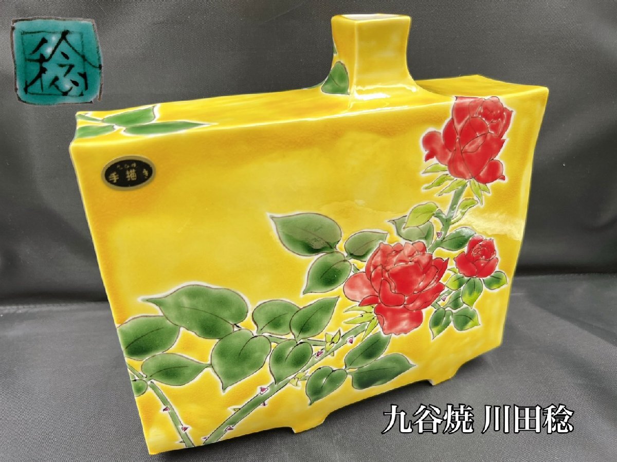 1円 九谷焼 川田稔 赤薔薇 手書き 角扁壺 花瓶 皿 鉢 焼き物 焼物 未使用長期保管品 【AN075】