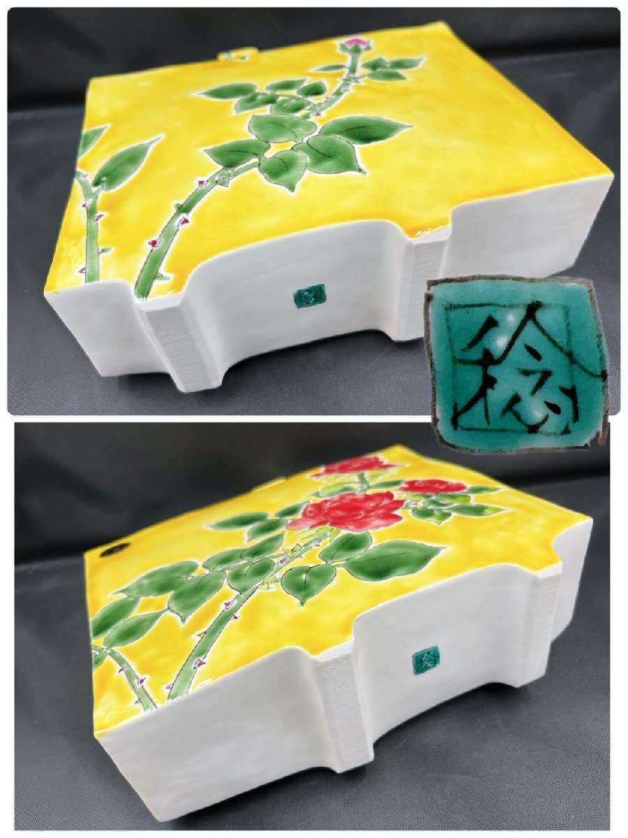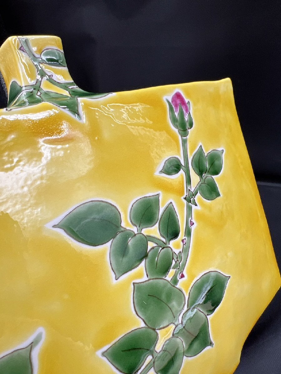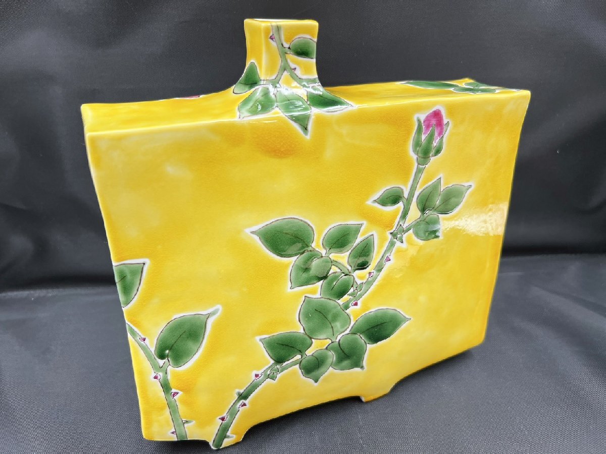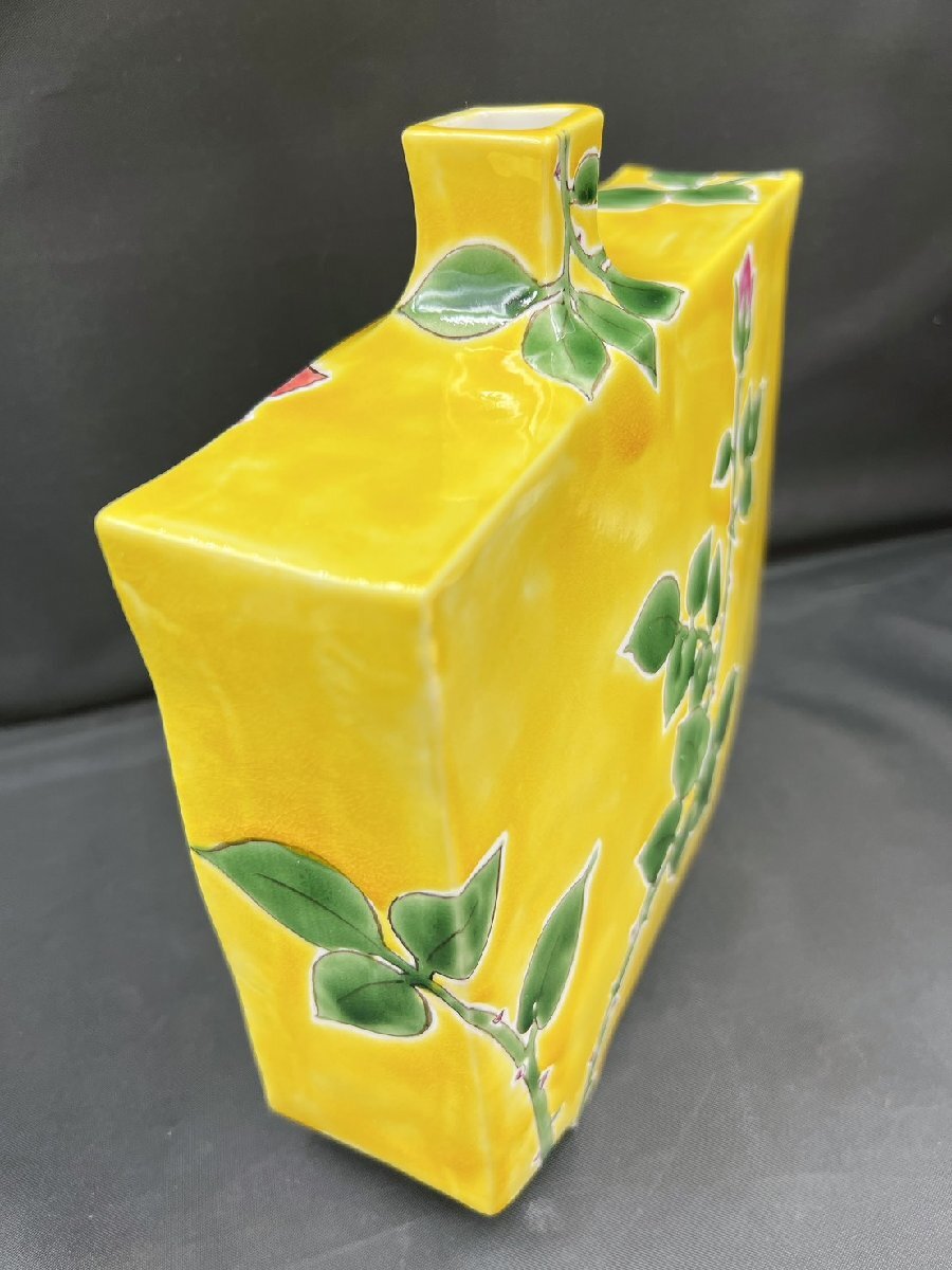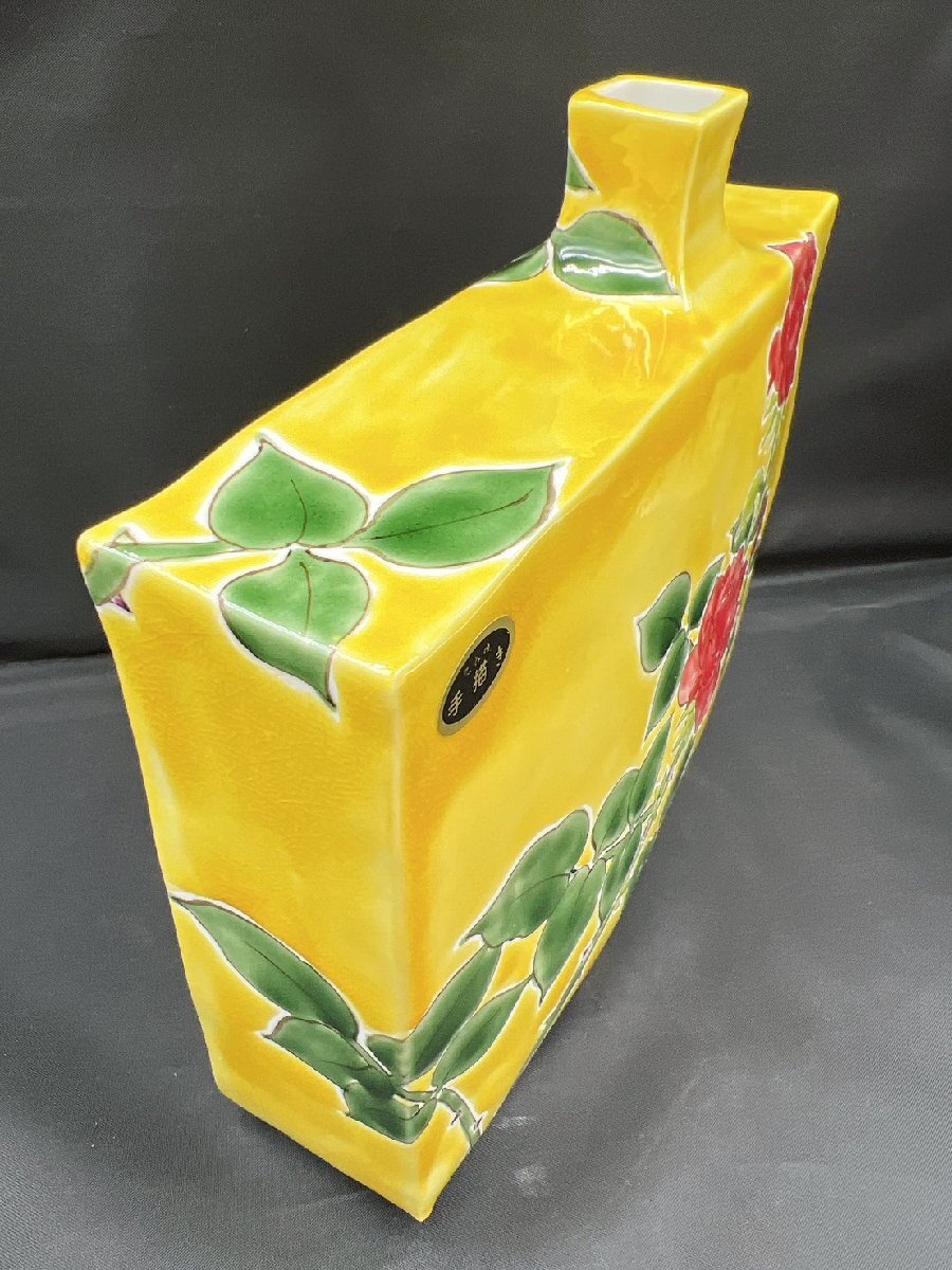1円 九谷焼 川田稔 赤薔薇 手書き 角扁壺 花瓶 皿 鉢 焼き物 焼物 未使用長期保管品 【AN075】