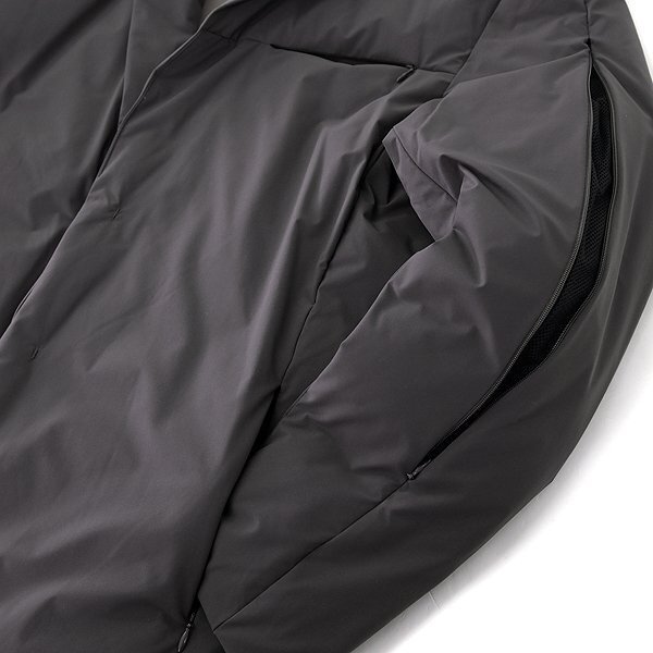 機能素材【SOLOTEX】を使用したテーラードダウンジャケットです。 ドレッシーなテーラードデザインのジャケットの内部に、700FP以上の高品質リアルダウンを敷き詰め、スポーティーで品のある大人のテーラードダウンジャケットに仕上げています。 表面の生地には、帝人フロンティアの機能繊維【SOLOTEX】に撥水加工をプラスしたテクニカルファブリックを使用。 SOLOTEXはその特殊な構造により、ソフトな風合いと縦横斜めに伸縮する高いストレッチ性、そして形状安定性・回復性といったマルチな機能を有します。 中綿にはダウン90%、フェザー10%、フィルパワー700以上の高品質ダウンを採用して高い保温性を確保。 袖にベンチレーションファスナーを配し、着用したまま内部の熱を外部に放出して体温調節が可能です。 ボタンに小振りなスナップボタン、ポケットは全てにコンシールファスナーポケットを採用し、よりスマートでスポーティーなルックスにこだわっています。 また、背面にキルトラインを施すことでダウンの着膨れ感を抑えた、すっきりとしたシルエットも魅力です。 同素材のパンツ(4-20501)と組み合わせると、ダウンのテーラードスーツスタイルが楽しめます。 【デザイン】 ・ダウン、フェザー入り ・フロントはスナップボタン2つ ・ノーベント ・袖横にベンチレーション付き |